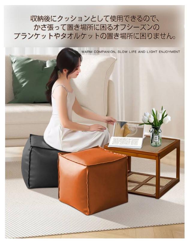 | タオルやブランケットを入れてクッションになる一石二鳥の収納ケース。 収納後にクッションとして使用できるので、かさ張って置き場所に困るオフシーズンのブランケットやタオルケットの置き場所に困りません。 クッションとして使用することで、押入れスペースを他の収納に使うことができます。 柔らかい上質なPUレザーを採用し、撥水加工で汚れが付きにくく、濡れたタオルで拭くだけ。 | |
