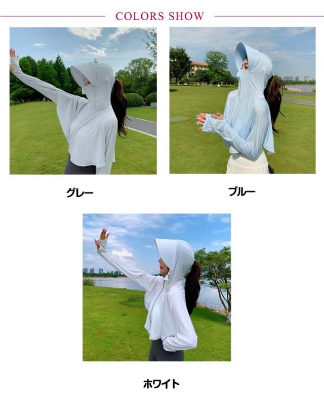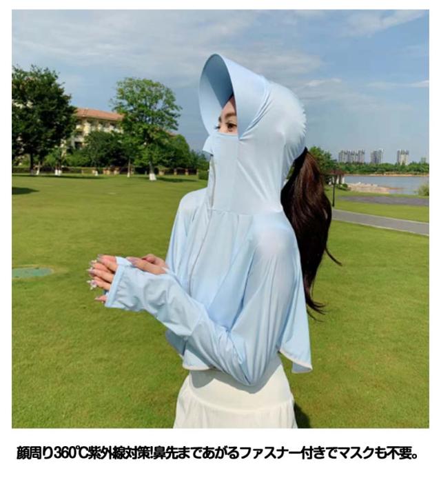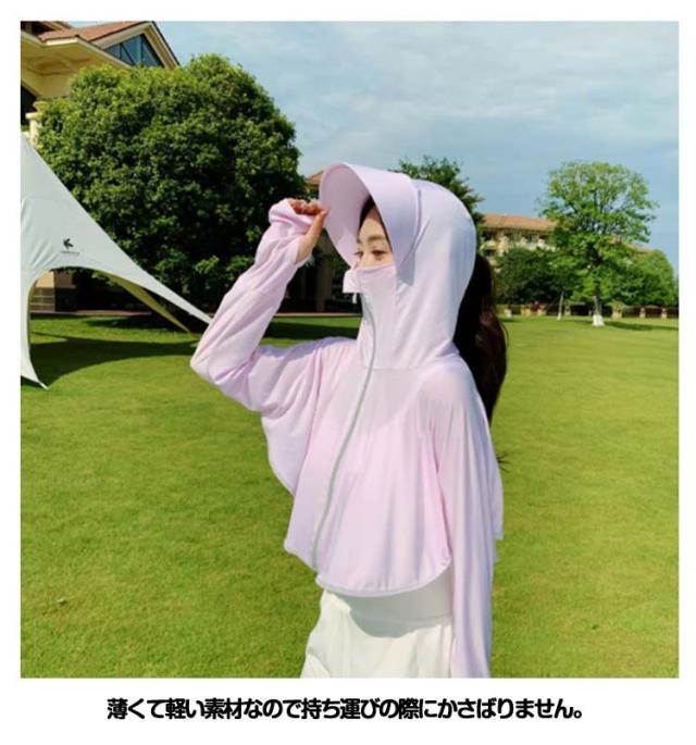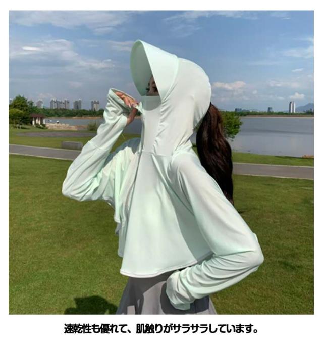 パーカー ラッシュガード ポンチョ ライトアウター UV ショート丈 ポニーテール ジップアップ レディース ショート丈 UVパーカー 穴あき 大きなツバ付 長袖 手の甲までカバー 顔 日焼け対策 クロップドパーカー