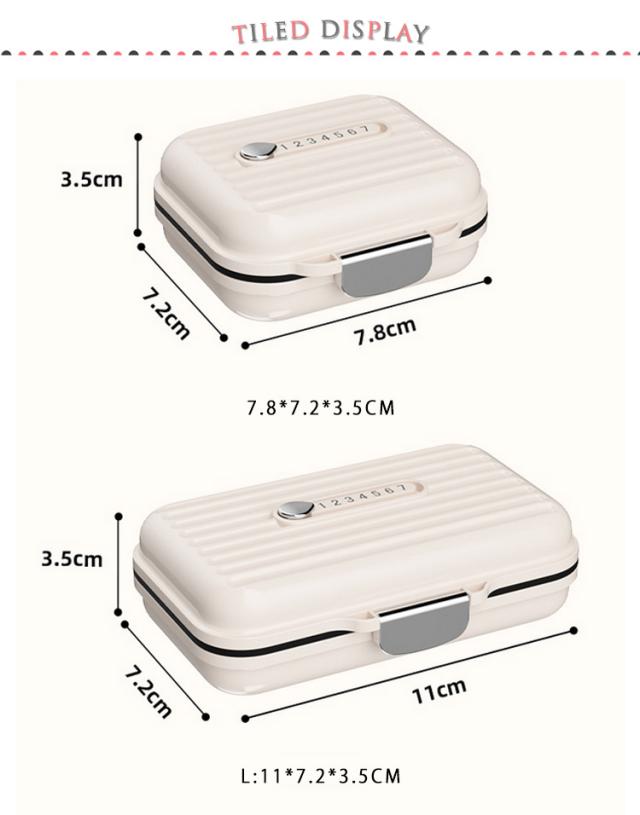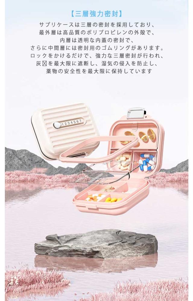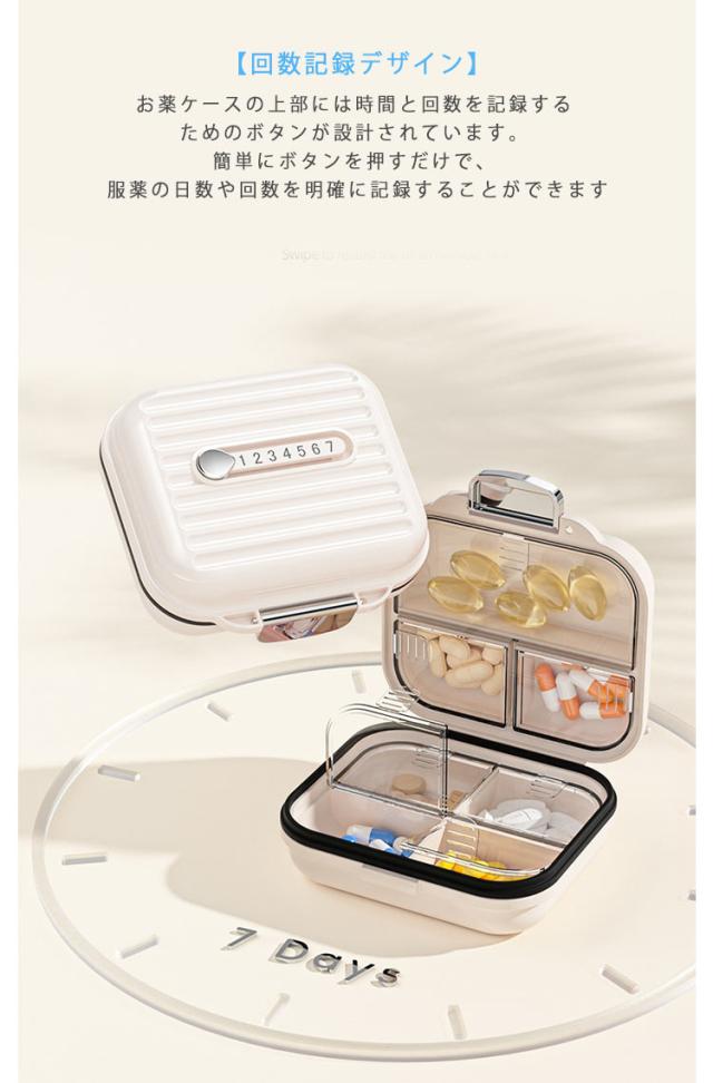 | 【三層強力密封】サプリケースは三層の密封を採用しており、最外層は高品質のポリプロピレンの外殻で、内層は透明な内蓋の密封で、さらに中間層には密封用のゴムリングがあります。ロックをかけるだけで、強力な三層密封が行われ、灰?を最大限に遮断し、湿気の侵入を防止し、薬物の安全性を最大限に保持しています。 【持ち運び】コンパクトて軽い体積でスペースを取らず、簡単にバッグやポケットに入れることができます。 【回数記録デザイン】お薬ケースの上部には時間と回数を記録するためのボタンが設計されています。簡単にボタンを押すだけで、服薬の日数や回数を明確に記録することができます。 【多様な収納に対応】薬盒の分格密封収納機能は、各層をよく小分けて、2層構造の7つの収納ボックスでき、日常の薬物やサプリなどの薬品だけでなく、釣具、指輪、ネックレス、耳飾り、ジュエリーなどの小物入れにも非常に便利です。 【高品質】食品グレードの高品質なPP(ポリプロピレン)プラスチックを使用しており、これはよく知られている嬰児の乳嘴や弁当盒などの製品にも使用されています。 | |