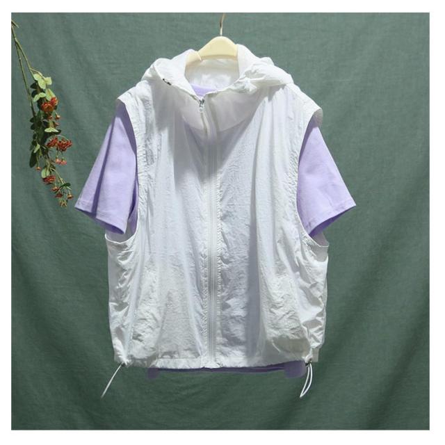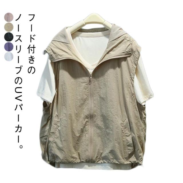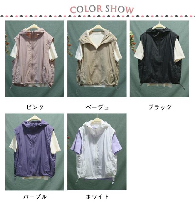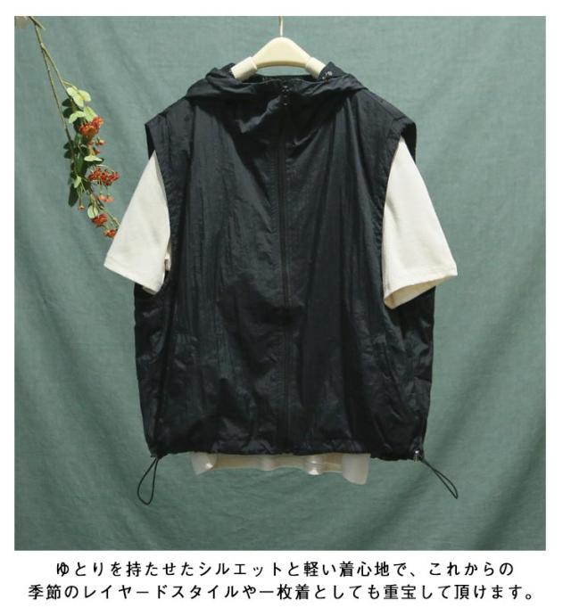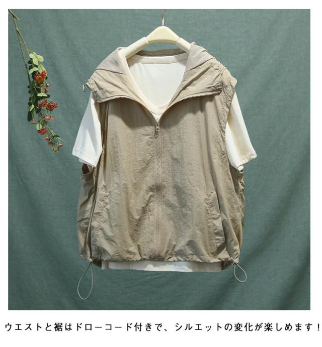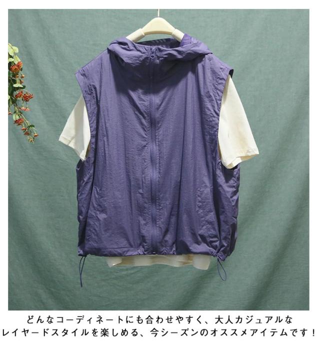 重ね着 前開き ジレ 大人 無地 ノースリーブ レイヤード アウター フード付き パーカー トップス ジャケット 薄手 レディース ベスト ライトアウター 前開き 夏 羽織り 着回し 涼しい ひんやり 軽量 通気 速乾 お釣り 撮影 登山服