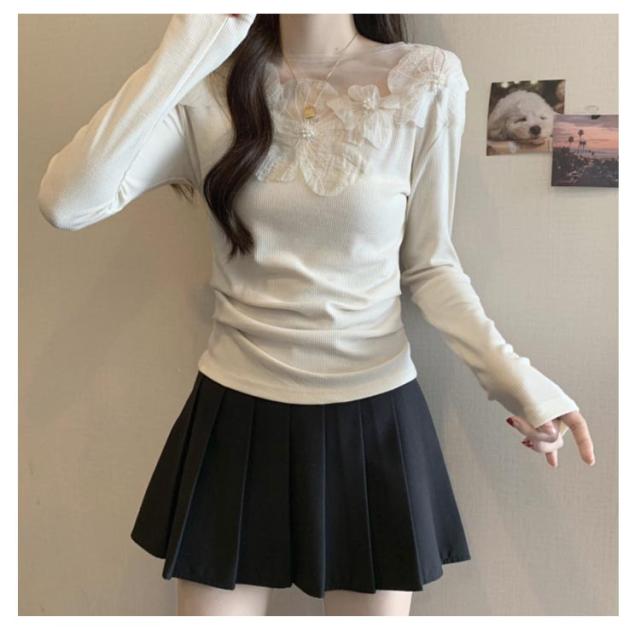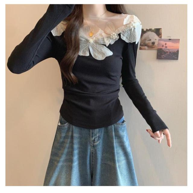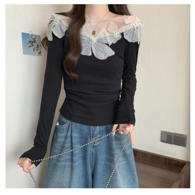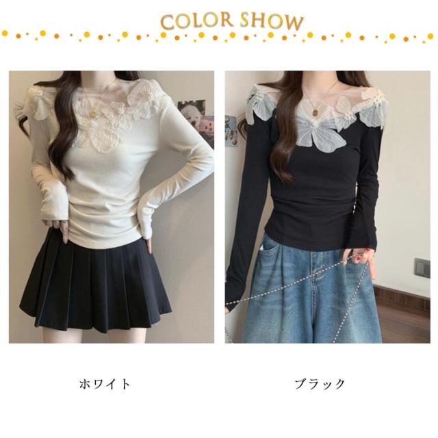 オフショル レース フラワーモチーフ デコルテ美人に トップス ブラウス 肩だし 花柄 オフショルダー レディース 長袖 オーガンジー ドッキング シアートップス シアーレース オフショルトップス 春 夏 トップス ブラック