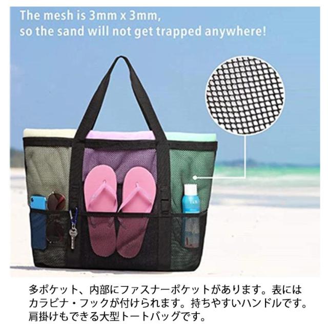 | 大容量のメッシュトートバッグです。砂場や海水浴、プール、温泉、ダイビングやお買い物、玩具入れに大活躍!通勤通学、ジム、旅行など荷物が多い時に便利なバッグ 多ポケット、内部にファスナーポケットがあります。表にはカラビナ・フックが付けられます。持ちやすいハンドルです。肩掛けもできる大型トートバッグです。 大き目ですが軽量でコンパクトに折り畳みできるトートので旅行や海など外出用に携帯できます。 網目なので砂や水が底に溜まりません。内部のポケットはファスナー付なので小物を収納できます。 メッシュ素材のトートは水に濡れても乾きやすいです。ご家庭で洗えます。 | |