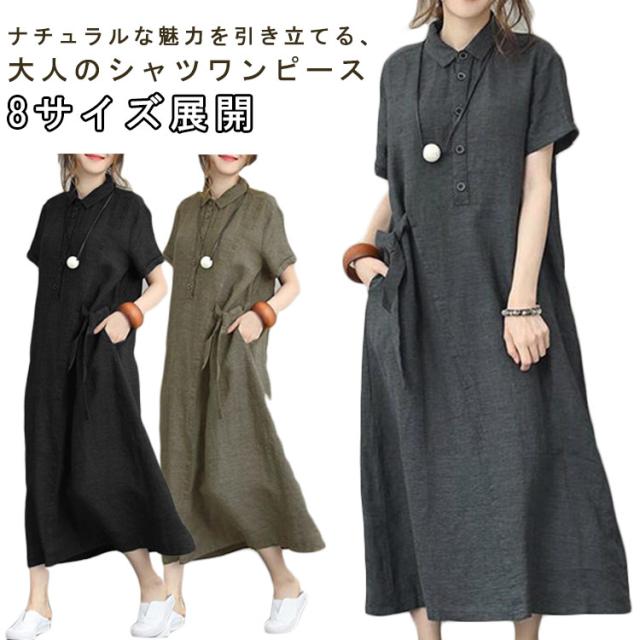 ロングワンピ レディース ワンピース マキシ丈 春 シンプル シャツワンピース 綿麻風 マタニティ 夏 無地 ゆったり 体型カバー ナチュラル 大きいサイズ カジュアル ワンピース 女性用