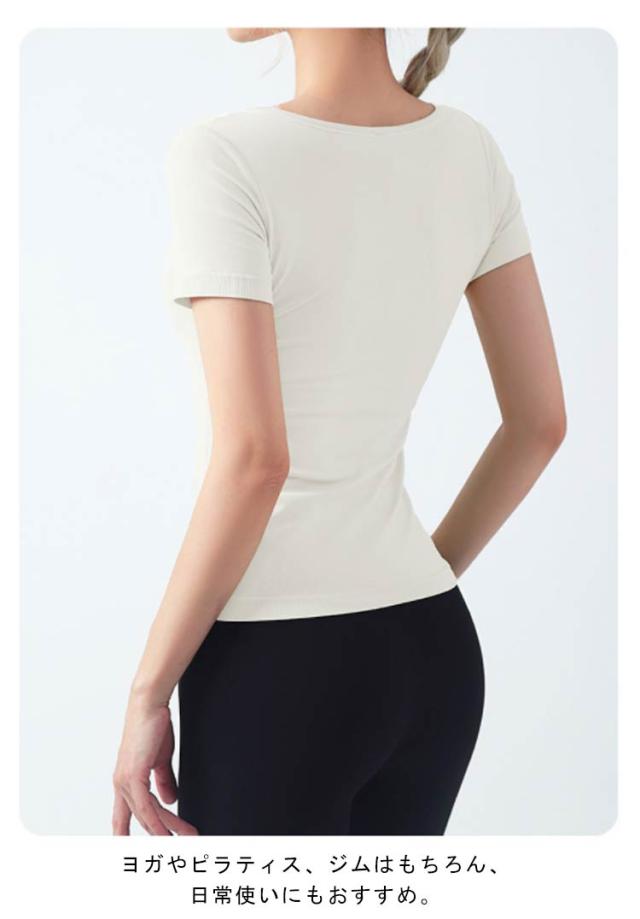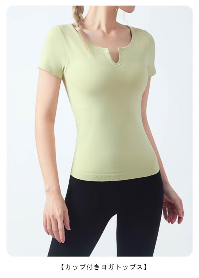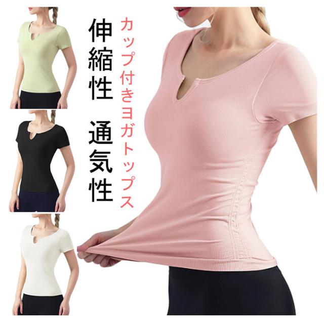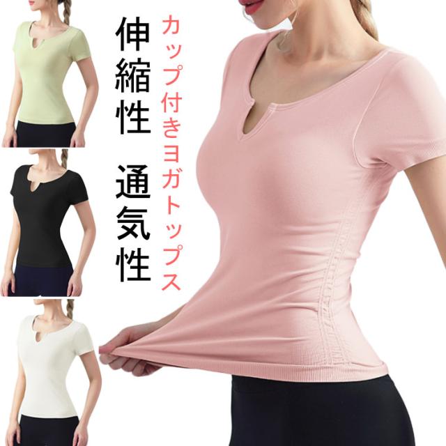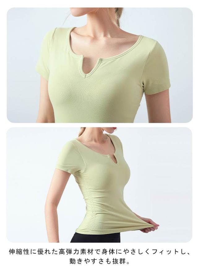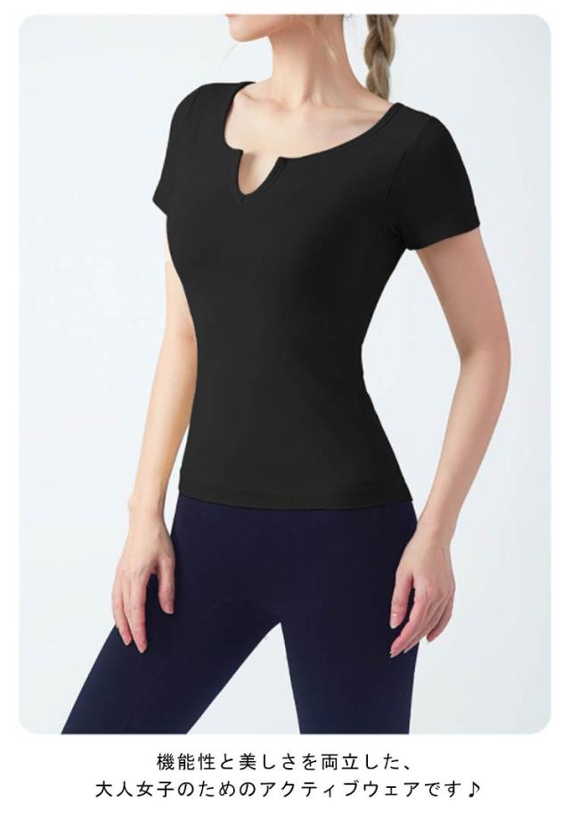 半袖 半袖 ヨガウェア ストレッチ カップ付き ヨガ 通気性 トップス シンプル 伸縮性 ピラティス トレーニング 吸汗速乾 ギャザー レディース フィットネス スポーツ ジムウェア ブラック