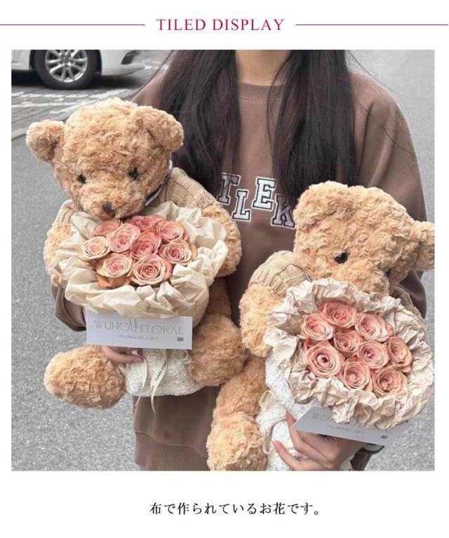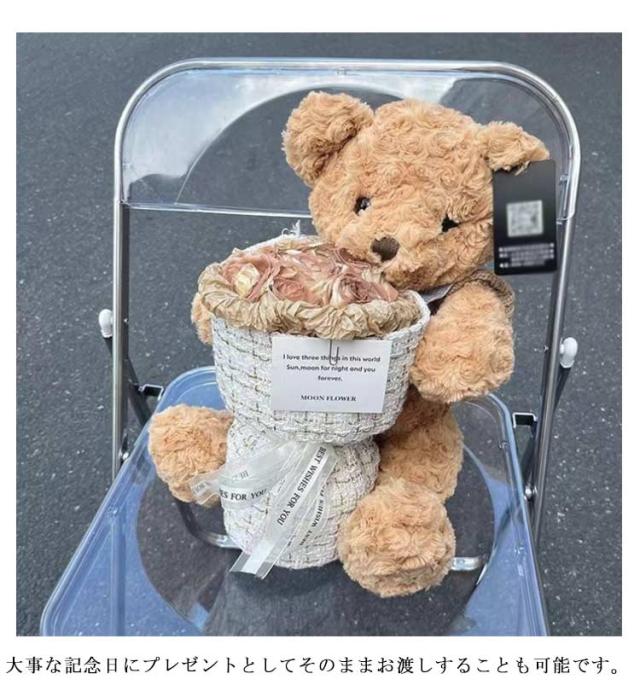 | 見てて思わず、笑顔になってしまう癒し満点なおぬいぐるみローズブーケです。【メッセージカード、ledライト付き】 布で作られているお花です。 生花のように水やりやお手入れの必要がなく、枯れる心配も虫や花粉の心配もありません。 ふわふわの愛らしいベアがどんな素敵なシーンも可愛く華やかに彩ります 大事な記念日にプレゼントとしてそのままお渡しすることも可能です。玄関やお部屋にそのまま飾って頂くだけで、ほのかな香りが楽しめるインテリアや飾りになるおしゃれな芳香剤として女性にも男性にも喜ばれるフラワーギフトです。 母の日、バレンタイン、入学式、卒業式、退職祝い、結婚式、誕生日、記念日など、ちょっとしたプレゼントにぴったりです。 | |
