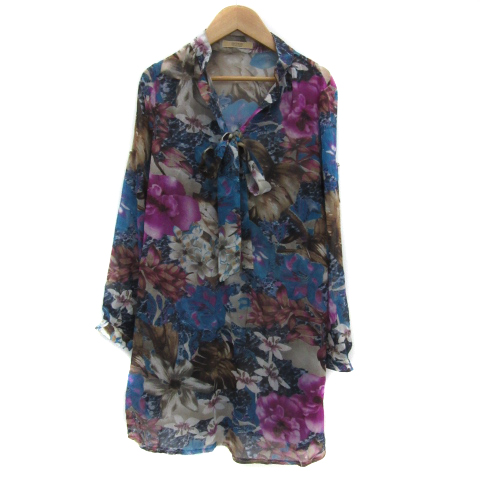 【中古】ブージュルード ENTREE シャツワンピース 長袖 ボウタイ 花柄 薄手 38 M マルチカラー 紺 レディース