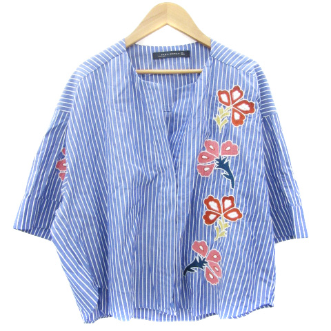 【中古】ザラウーマン シャツ ブラウス 七分袖 スリットネック ストライプ柄 花柄刺繍 S ブルー 青 レディース