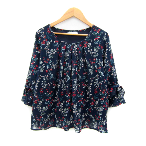 【中古】グローブ grove ブラウス カットソー 七分袖 ラウンドネック 花柄 マルチカラー M 紺 ネイビー レディース