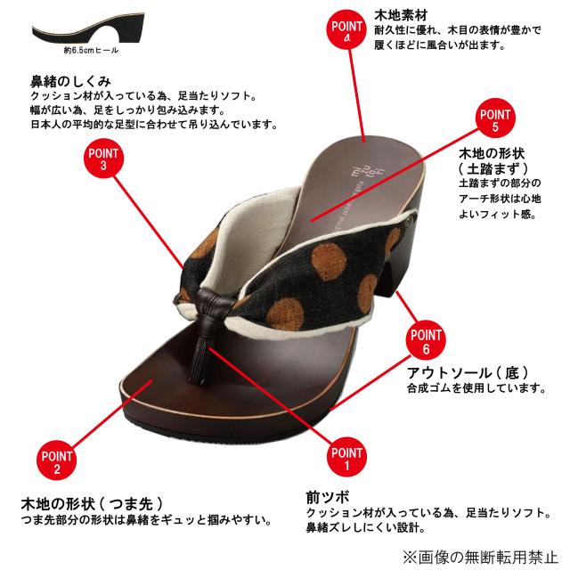 足裏にフィットするように施されたオリジナルの彫りと、クッション性のある鼻緒による履き心地の良さを実現した、浴衣や着物はもちろんお洋服にも似合うシンプルなデザイン。日本の伝統的なカタチがモダンな雰囲気を演出。