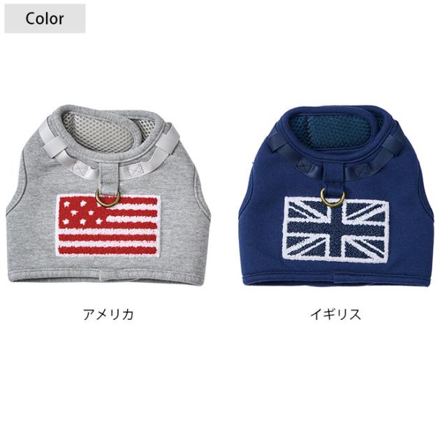 大きな国旗の刺繍がインパクト大な、犬用のウェアハーネス。