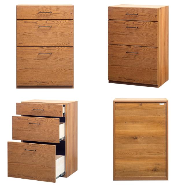 お好みで組み合わせて、自分だけの収納を作ることができるキッチン収納の「3段チェスト」です。木目が美しいオークの突板を前板に使用し、天然木の温かみを感じられるナチュラルな印象。何年経っても飽きのこない、暮らしにぴったりと寄り添う1台です。