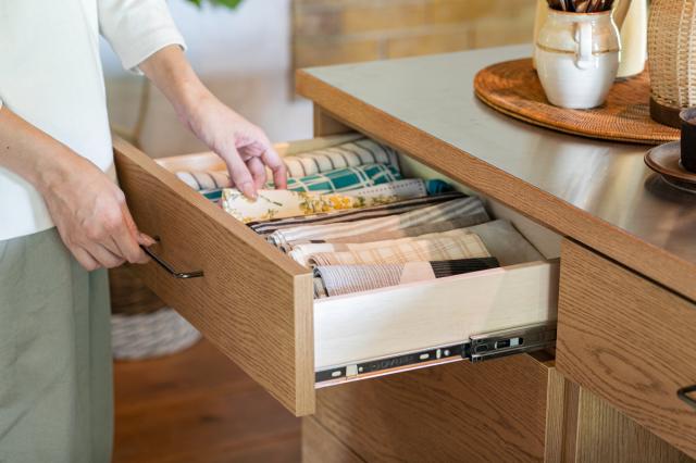 3段の引出しは、全て深さが違います。カトラリーや布巾類、背の高い調味料や食品のストックなどを、たっぷりと収納しておけます。全段スライドレール仕様なので、開閉がスムーズです。