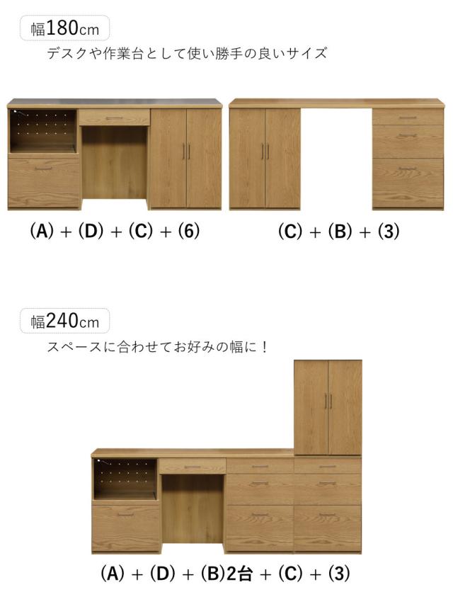 (B)3段チェスト + (D)カウンターテーブル + (C)可動棚開き戸 +(6)幅180cm ステンレス天板