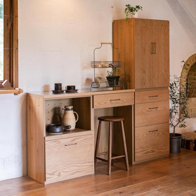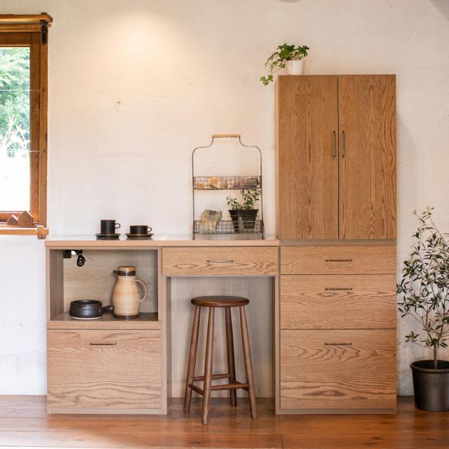 お好みで組み合わせて、自分だけの収納を作ることができるキッチン収納の「可動棚開き戸」です。木目が美しいオークの突板を前板に使用し、天然木の温かみを感じられるナチュラルな印象。何年経っても飽きのこない、暮らしにぴったりと寄り添う1台です。