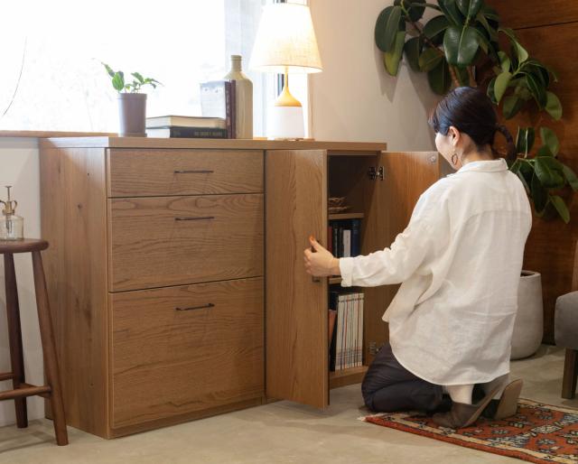 ![]() 蒸気の出る家電に スライド棚深引出し | ![]() たっぷり収納 3段チェスト | ![]() A4サイズ対応 可動棚開き戸 |