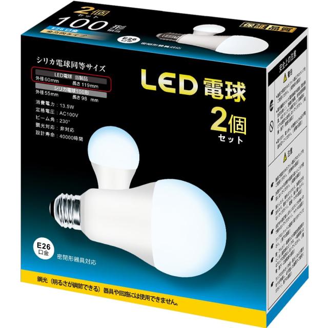 ◆商品名:LED電球 100形 昼白色 相当 E26口金 直径26mm 13W 1600Lm 広配光 密閉器具対応 高輝度 全方向タイプ 2個セット