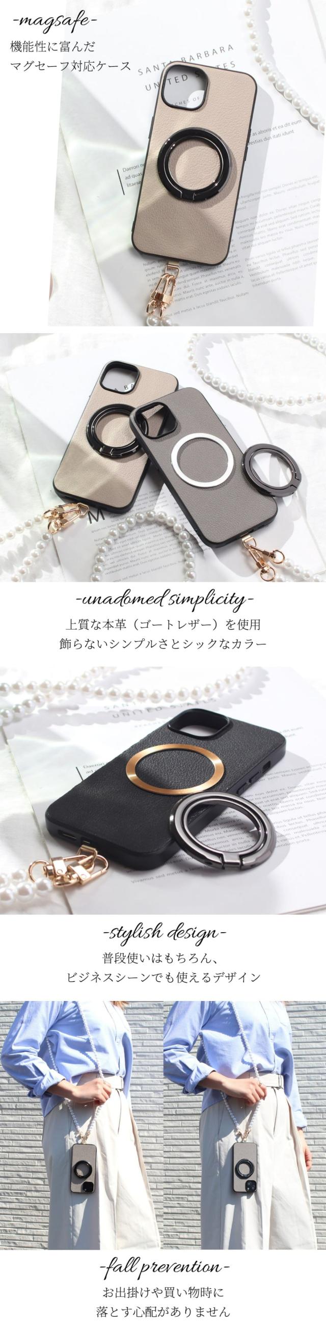 iphone ケース 本革 iphone16 iphone15 iphone14 iphone13 リング付き パール ストラップ レザー 16 15 14 13 13mini マグセーフ対応 magsafe対応 ゴートレザー 16e 16pro 15pro リング ストラップ付き 肩掛け スタンド マグネット 16プロ 13ミニ メタリック スリム 送料無料