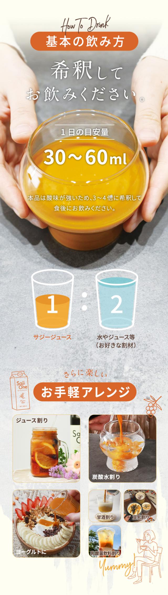 1日60〜100mlを目安に、2〜3倍程度に希釈してお飲みください。※2倍希釈時果汁27.5%(サジー1:ジュースや水など1)