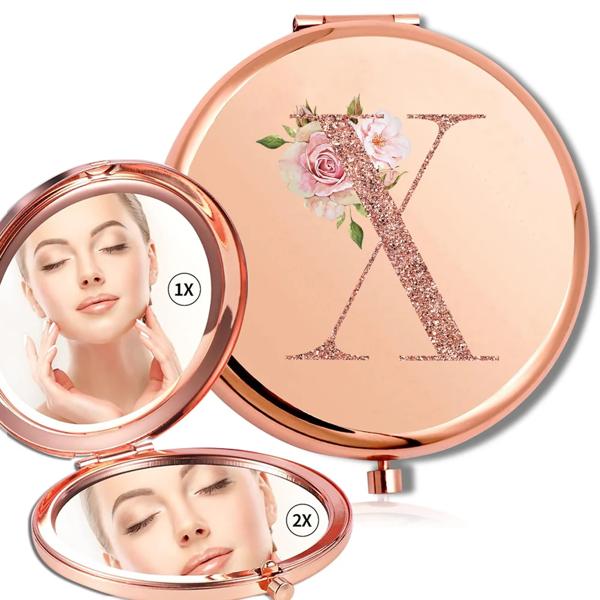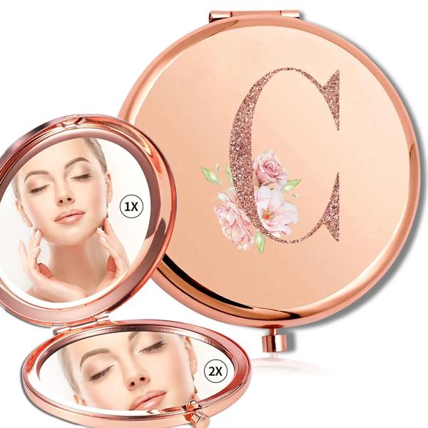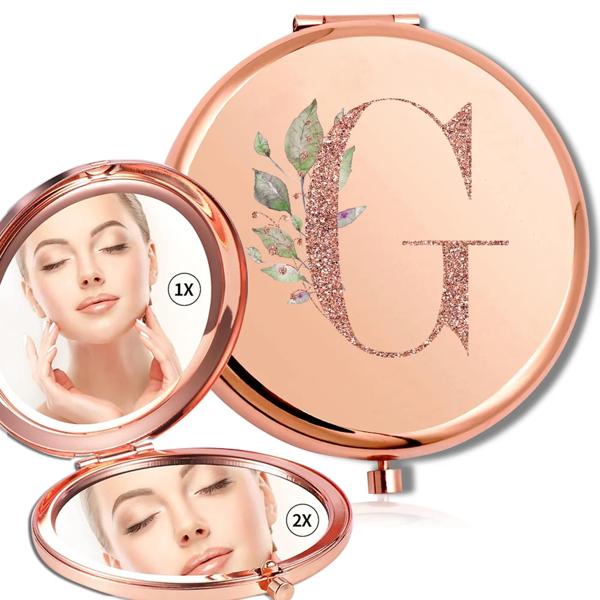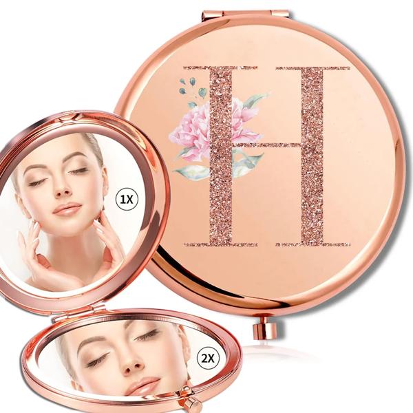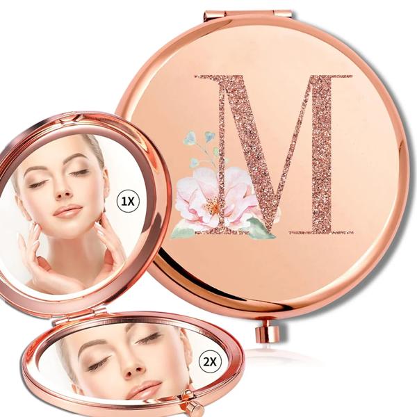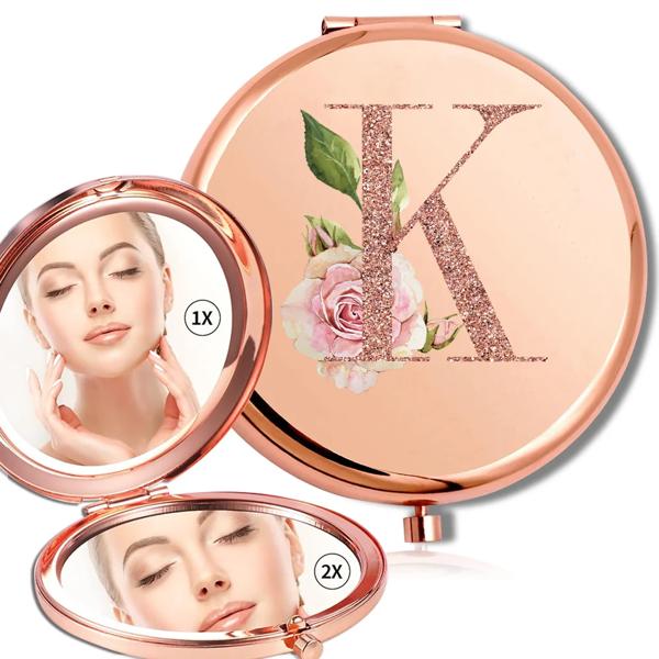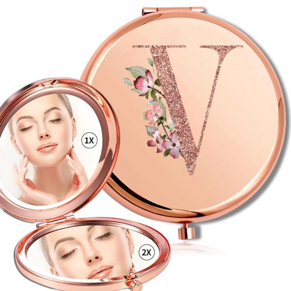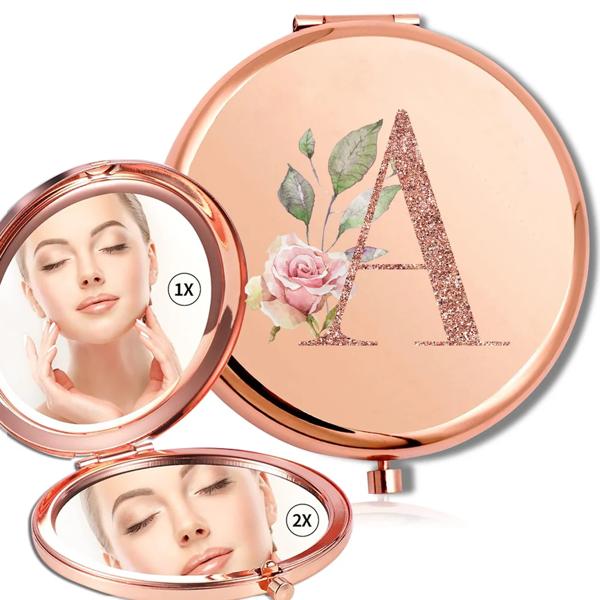 拡大鏡メイクラウンドミラー両面金属化粧品ポータブルルックガラスコンパクトハンドヘルドミラーローズゴールド文字パターン