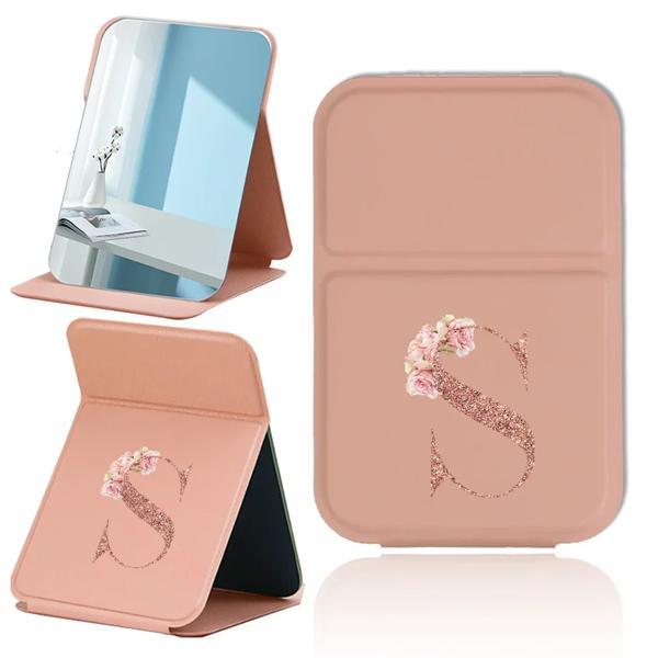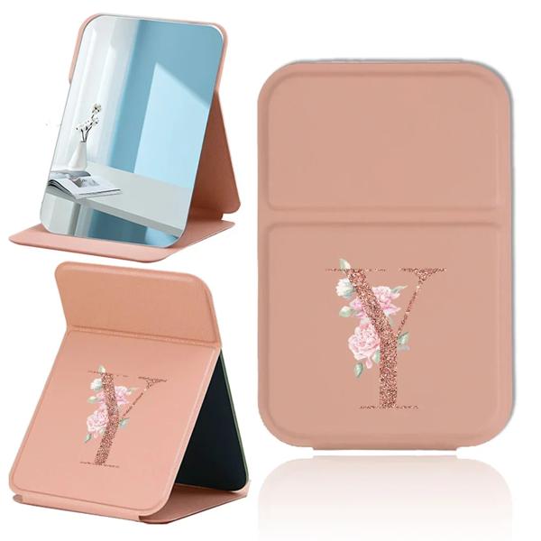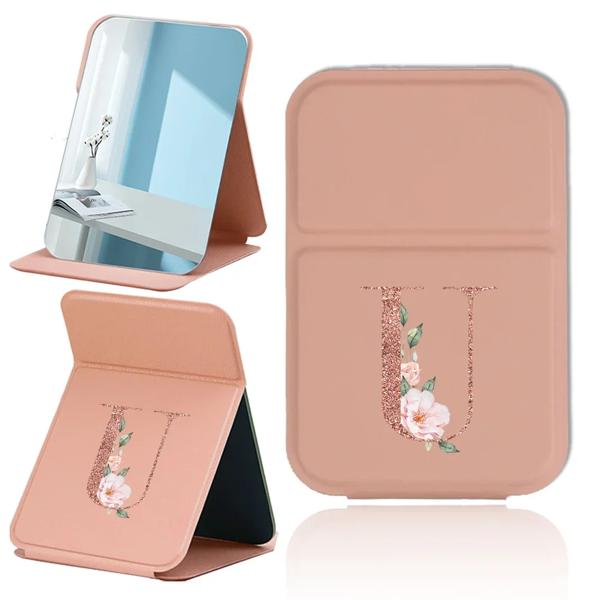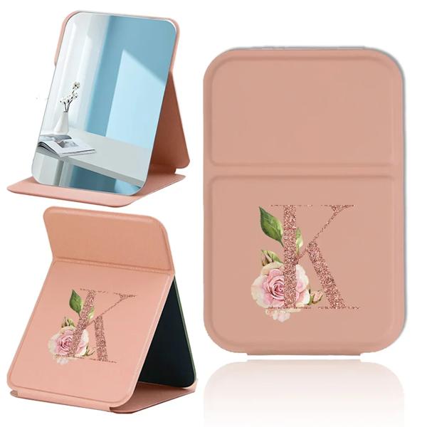 折りたたみデスクトップ化粧鏡ハンドヘルド PU 旅行化粧鏡ポータブルレザーアンチスリップポケットミラーローズゴールド文字パターン