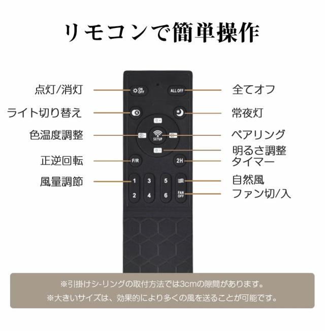 当店のシーリングファンが首振り機能がありません、ご注意くださいませ。ご購入前に天井の配線器具の確認をしてください。天井に穴開け必要がありませんが、配線器具により取付け方が異なります。必ず天井の強度をご確認ください。 ●取付けアタッチメント:引掛埋込ローゼット、角型引掛シーリングボディなど ※引掛けが異なり、またフックも何センチの厚みがあり、シーリングのフックと配線器具の間に隙間が出る場合がございます。 ※適切な羽の高さ:床から220〜250cm ※リモコン付き(単4電池×2個必要※電池は付属していません) |