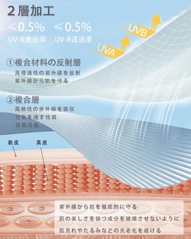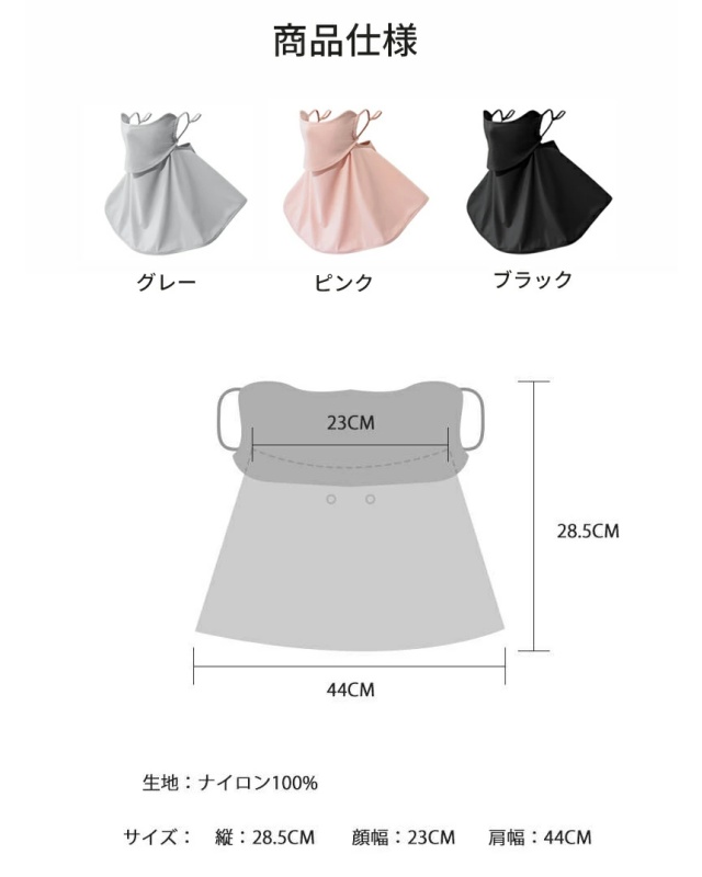 特徴:◆接触冷感Q-MAX0.33◆UVカット率 98%◆UPF 50+◆洗濯可能◆開口設計