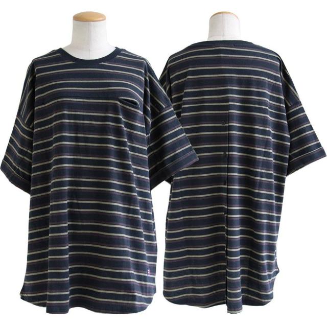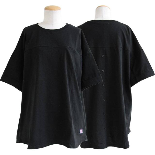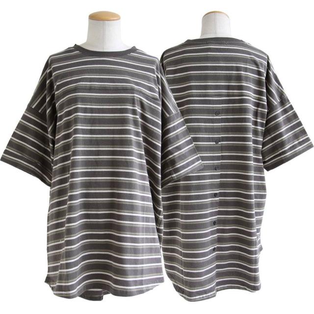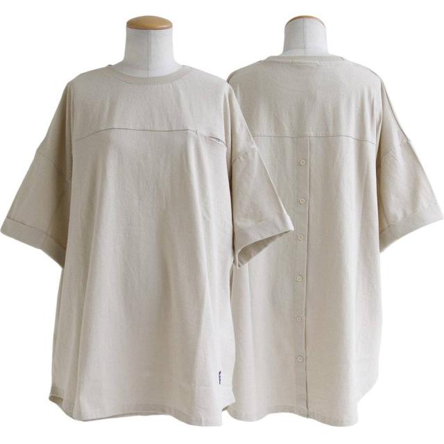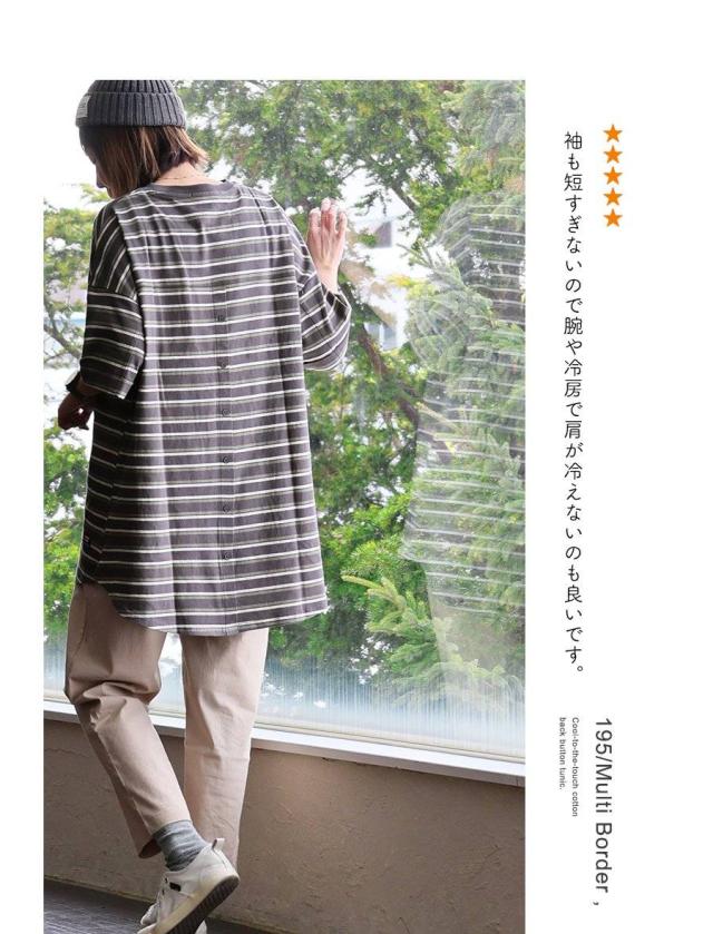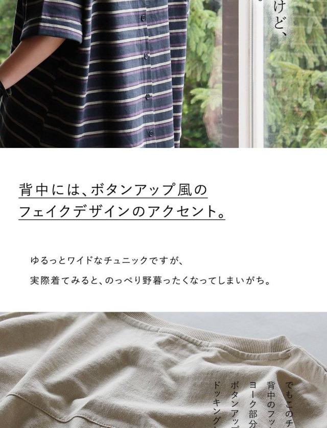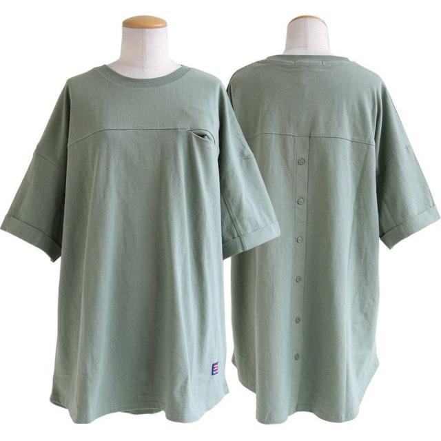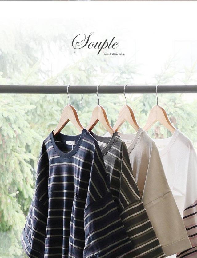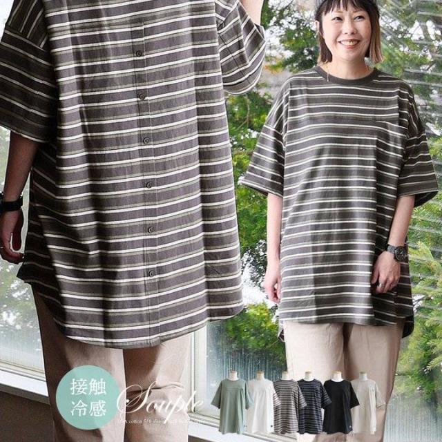 【メール便50】 着痩せ チュニック tシャツ ロング ワイド レディース 五分袖 すっきり 切替 ゆったり tシャツ しっかり 柔らか 綿100% USA コットン バック ボタン ポケット お尻 二の腕 隠れる カバー 5分袖 半袖 大人 カジュアル パティ Souple スプル