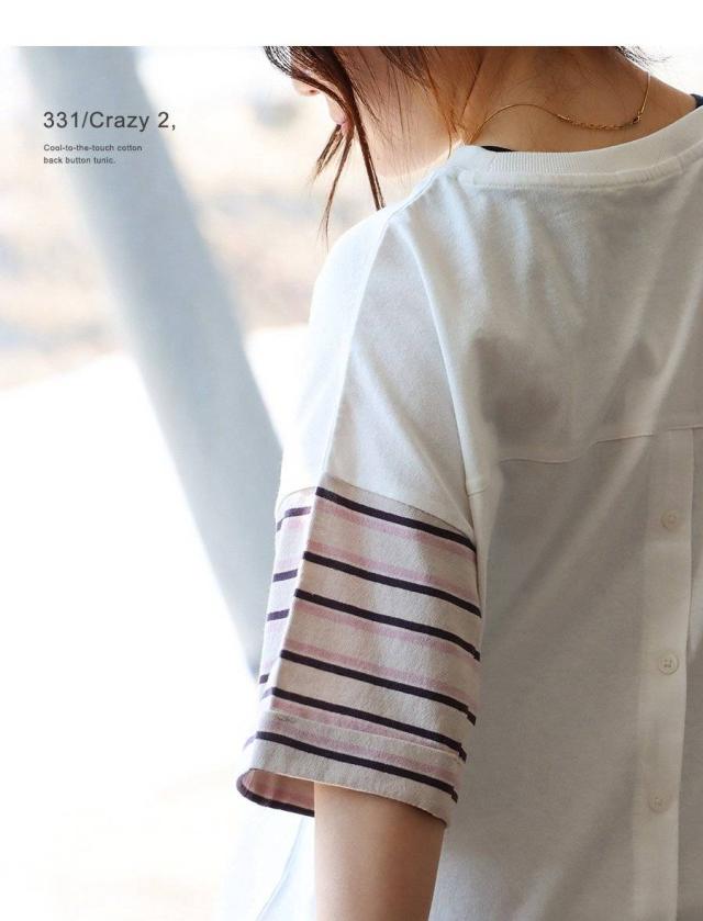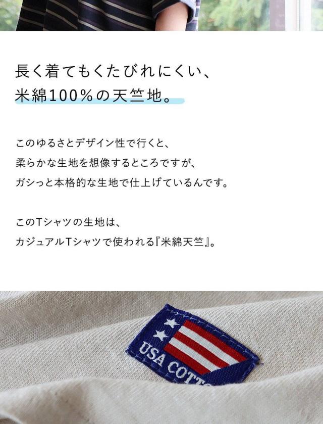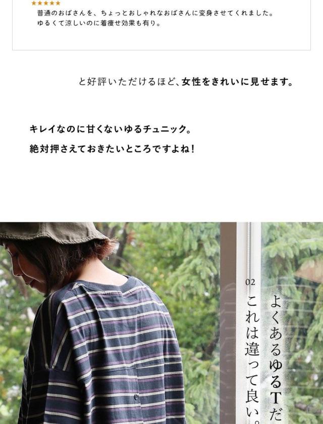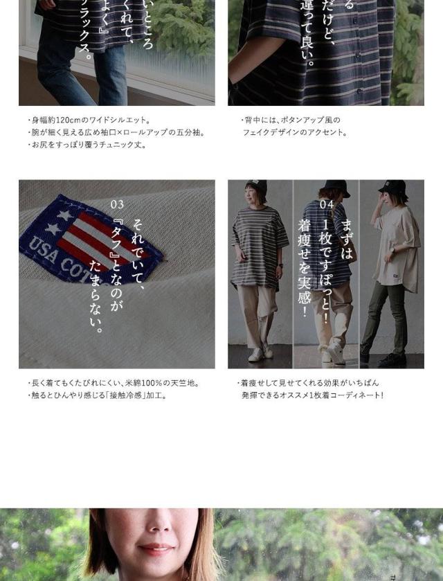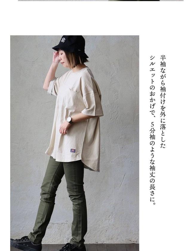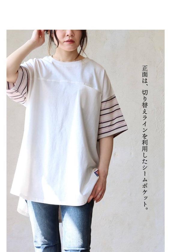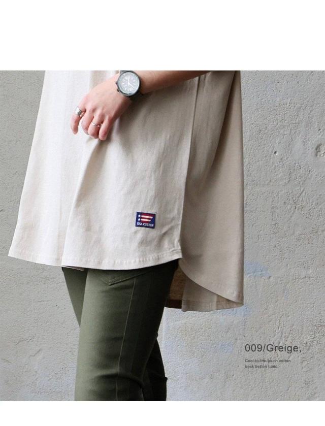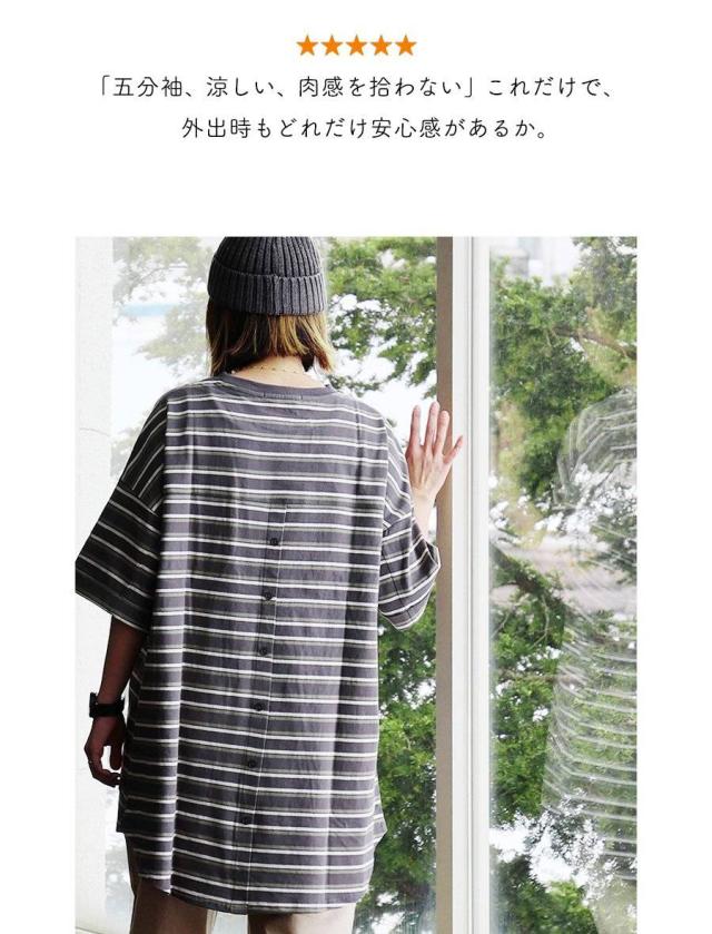 着痩せ チュニック tシャツ ロング ワイド レディース 五分袖 すっきり 切替 ゆったり tシャツ しっかり 柔らか 綿100% USA コットン バック ボタン ポケット お尻 二の腕 隠れる カバー 5分袖 半袖 大人 カジュアル パティ