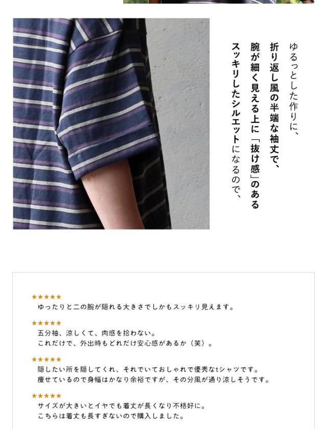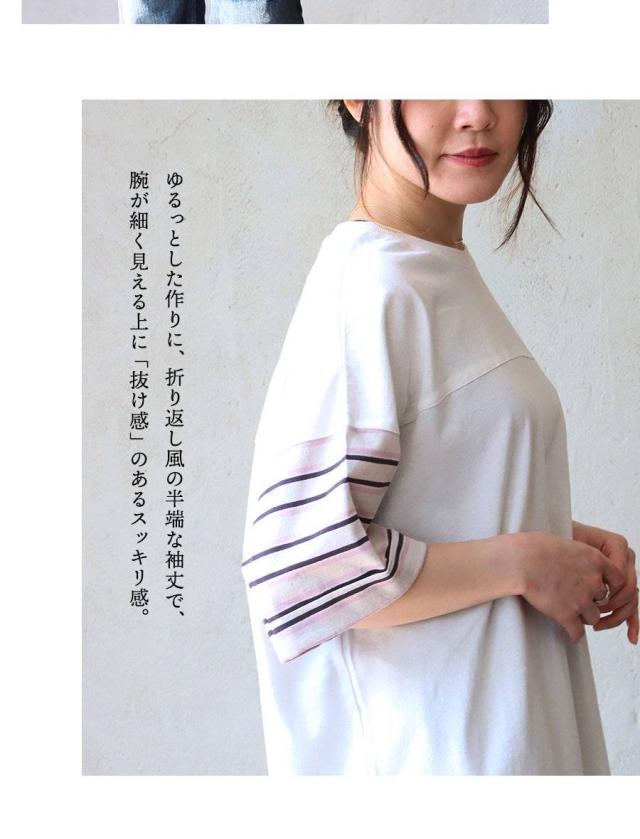 ・腕が細く見える広め袖口×ロールアップの五分袖。