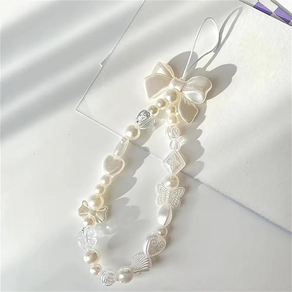 蝶とハートのチャームが付いたエレガントな白い真珠のストラップ、IDバッジホルダーとキー用の弓のアクセントが付いたプラスチック製のリストストラップ