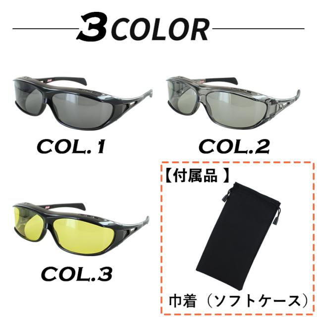 | ●カラー COL1 フレーム:ブラック レンズ:スモーク偏光 COL2 フレーム:クリアグレー レンズ:ライトスモーク偏光 COL3 フレーム:ブラック レンズ:イエロー偏光(夜間運転対応) | ●素材 フレーム:プラスチック レンズ:プラスチック(偏光レンズ)(コーティング) ●可視光線透過率 COL1:約20% COL2:約40% COL3:約75% ●紫外線透過率:1.0% |