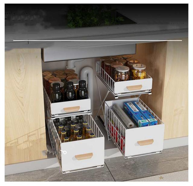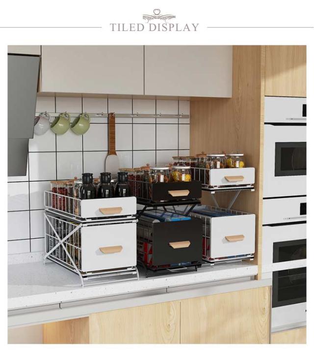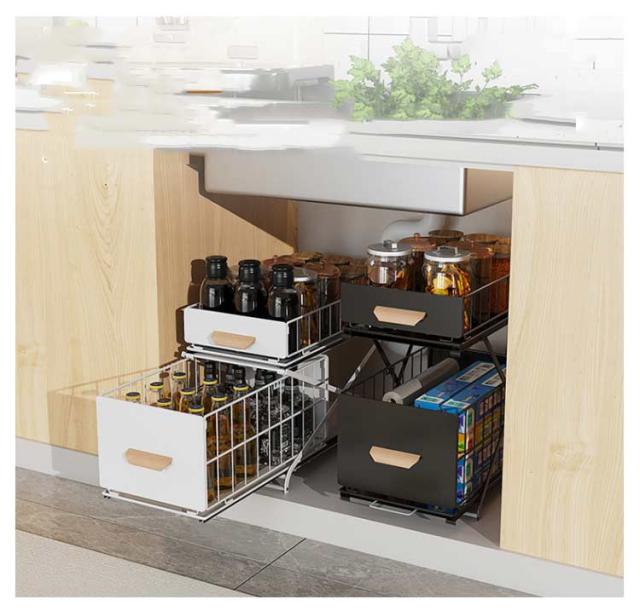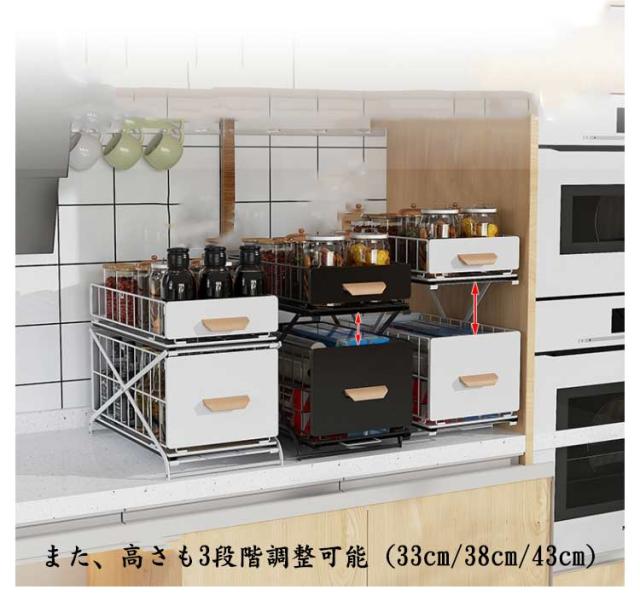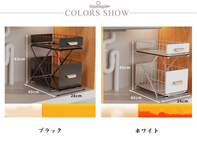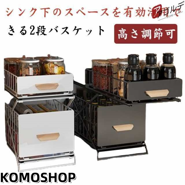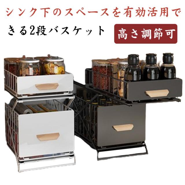 シンク下収納バスケット 2段 折りたたみ 引き出し スライド ラック ストッカー 収納棚 メッシュ スパイスボトル 高さ調整可 組み立て不要 デッドスペース 有効活用 シンク下ラック シンク下ストッカー シェルフ キッチン