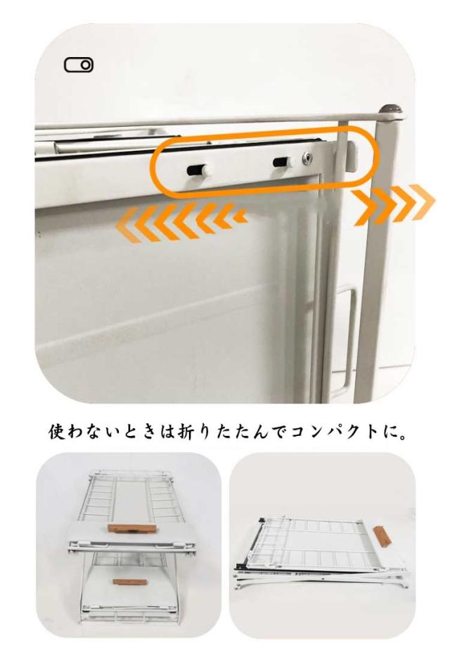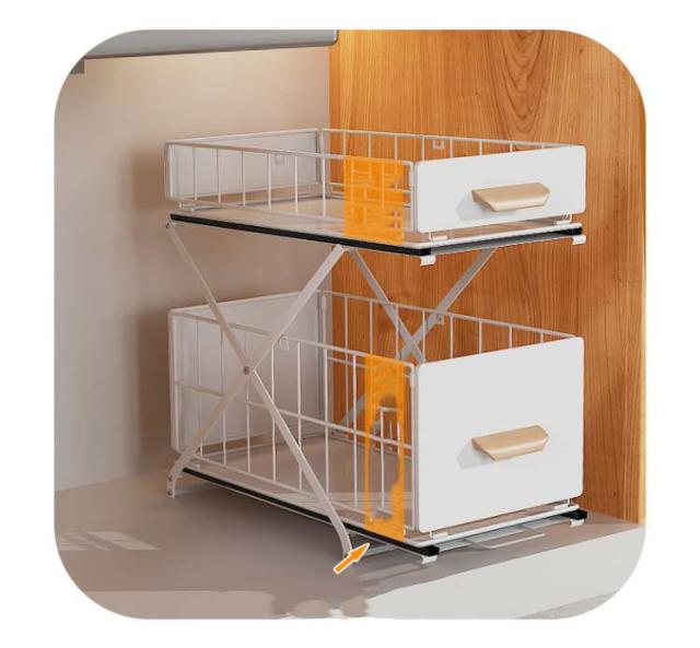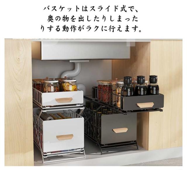 | ・シンク下のスペースを有効活用できる2段バスケット ・バスケットはスライド式で、奥の物を出したりしまったりする動作がラクに行えます。 ・また、高さも3段階調整可能(33cm/38cm/43cm) ・調味料から缶詰、またサニタリーでは洗剤のストック類の収納でも活躍します。 ・使わないときは折りたたんでコンパクトに。 | |