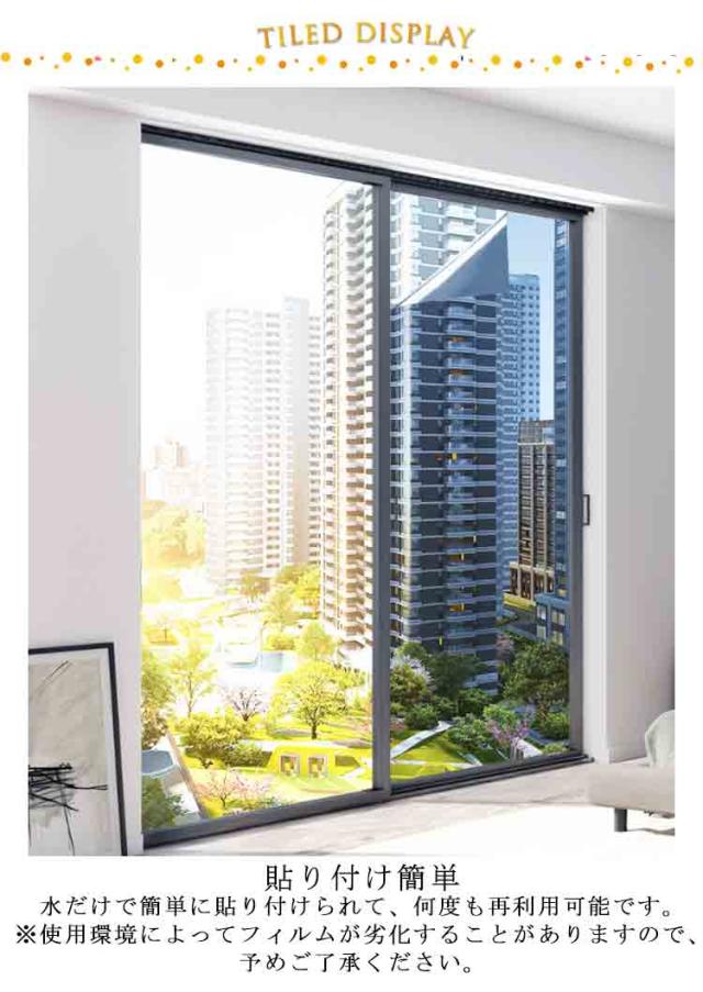 | 【水で貼れる】 【紫外線対策・遮光・断熱】 【目隠し】 【飛散防止・キズ防止】 外から見えない!!マジックミラー窓ガラスフィルム ★貼り付け簡単 水だけで簡単に貼り付けられて、何度も再利用可能です。※使用環境によってフィルムが劣化することがありますので、予めご了承ください。 ★目隠し効果 充分な天然の日光を室内に取り込めて明るさを維持しながら、外からの視線を遮ります。大切なプライバシーをきちんと守ります。 ★紫外線対策 室内に入る有害な紫外線を大幅カットして、眩しい直射日光を和らげて肌を刺すようなジリジリ感などの不快を抜き取り、紫外線による家具の日焼け、変色、劣化も軽減できます。 ★飛散防止・キズ防止 静電気吸着効果が粘着力を引き出し、台風や地震時にガラスが割れても破片は飛び散りません。また、ガラス表面の擦り傷も防ぎます。 ★冷暖房効率アップ 夏には赤外線(太陽熱)を反射吸収し、室内に入る熱気を抑え、冷房で涼しくなった室温を保つことができます。冬には、暖房の暖気を逃さない効果があり、冷暖房の省エネにもなります。 【適用ガラスタイプ】 ◎ 全ての滑らかな表面(凹凸がない)ガラスに適用です。 ? 木材、タイルやすりガラスなど粗い表面と多孔性表面のガラスに適用しません。 【その他】 窓ガラスフィルムは1m単位で販売しておりますが、2m以上のご注文については繋がった状態のものを出荷いたします。例えば3本の(20cmx1m)をご注文の場合、(20cmx1m)×3本ではなく、(20cmx3m)×1本でお届けします。 | |