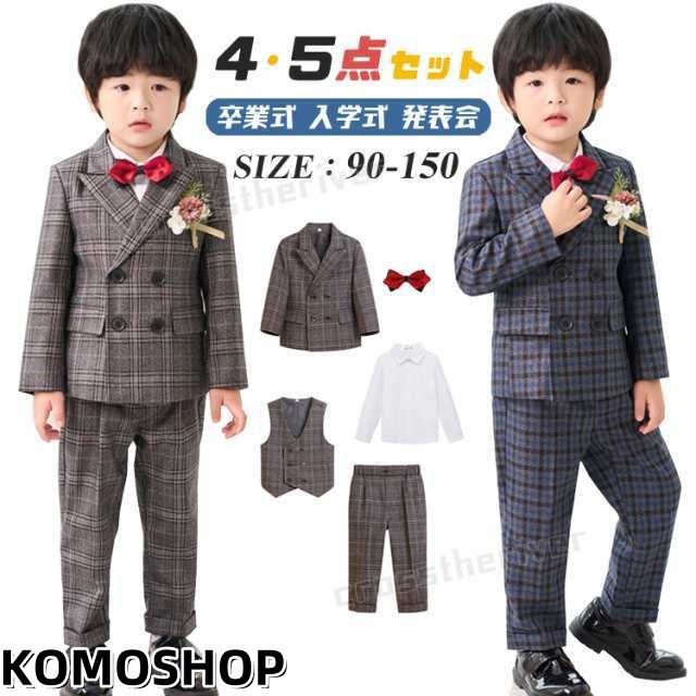 ピアノ発表会 パンツスーツ 卒業式 入学式 スーツ 男の子 フォーマル チェック柄 110 120 130 ブレザー 4点 5点セット 卒服 入学式 子供スーツ ベビースーツ 卒園式 入園式 長袖 ズボン シャツ ベスト ジャケット リボン ネイビー 韓国 七五三 結婚式 小学生 撮影 80cm 150cm