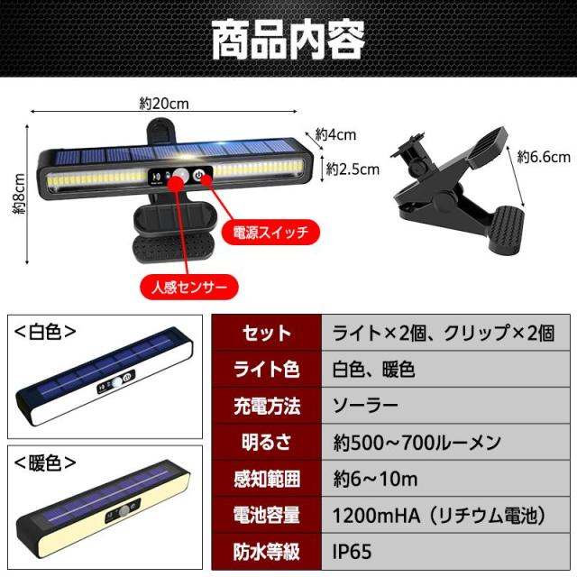 商品名: ソーラー ライト センサーライト 屋外 led クリップ 防水 人感 充電式 防犯 強盗 空き巣 ガーデン 玄関 廊下 自動点灯 消灯 照明 明暗 明るい 壁掛け 室内