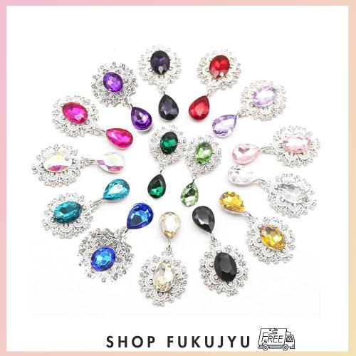 【多彩なアクセサリーパーツ】台座の中央には大きなパーツがあり、15色(透明/白/紫/青/金/緑/赤/黒など)があります。周りにもキラキラしたパーツが飾られていて、豪華で美しいパーツです。水滴パーツが付いているので下に揺られて上品に見えます。