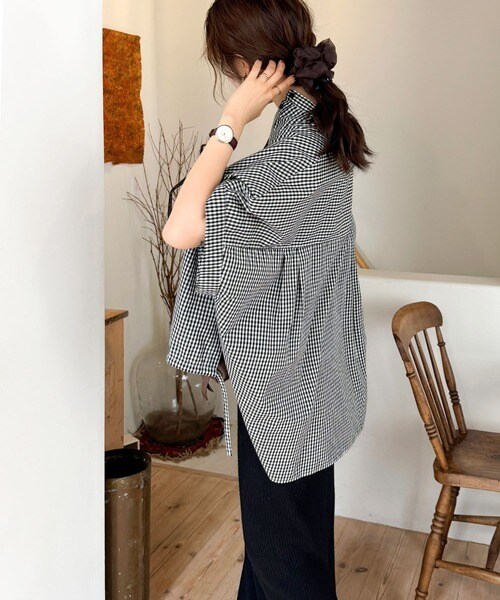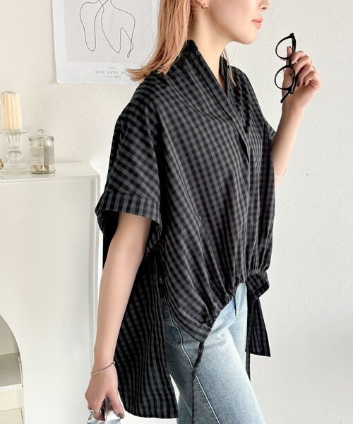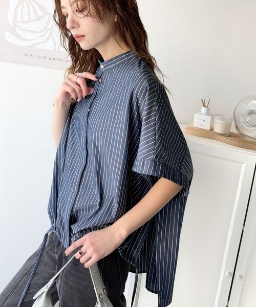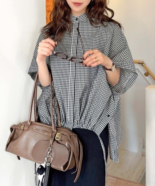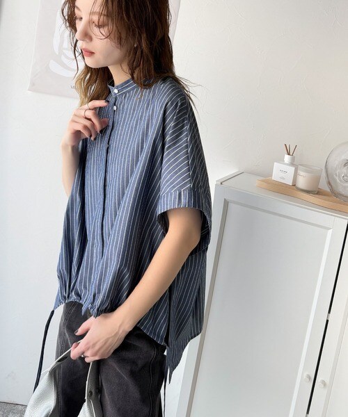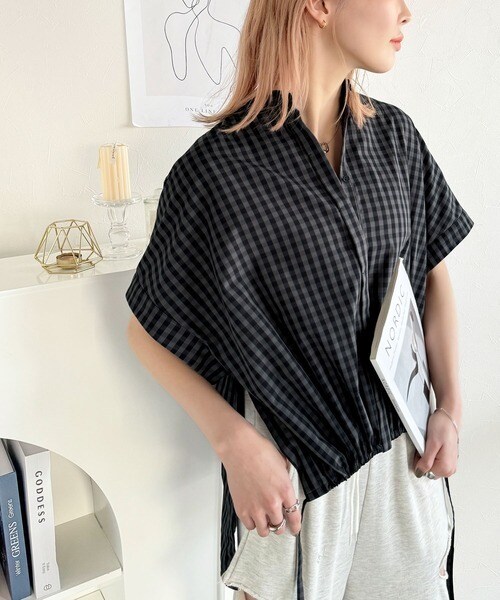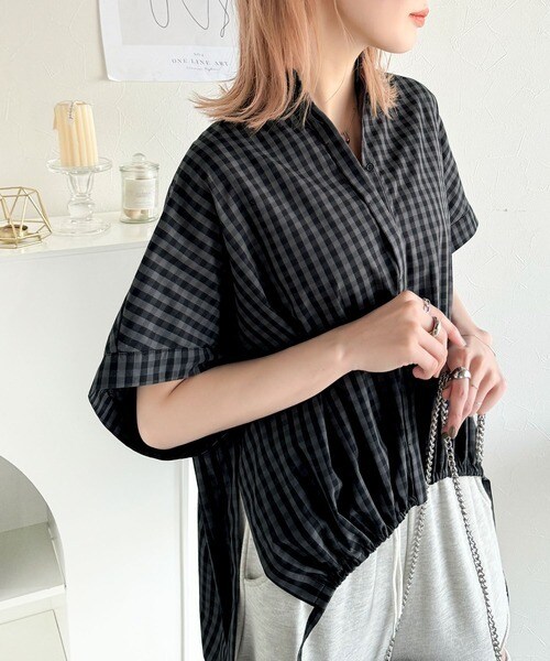 サイドボタンスリットドロスト半袖バンドカラーオーバーシャツ(ストライプ/ギンガムチェック)