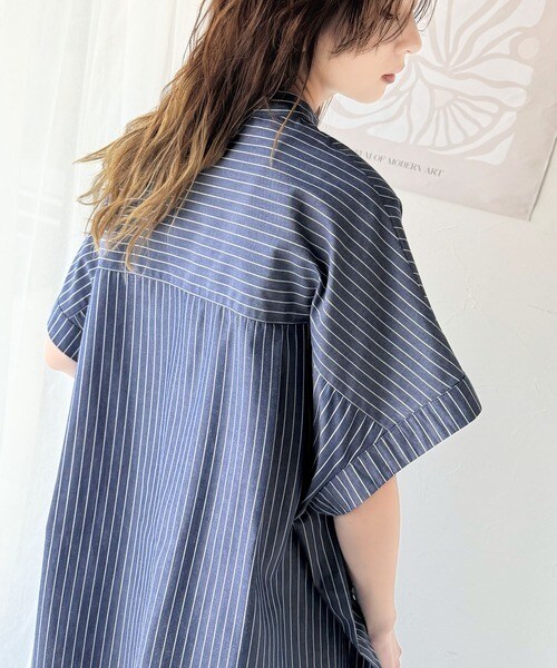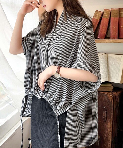 クラシカルエルフ(Classical Elf)/サイドボタンスリットドロスト半袖バンドカラーオーバーシャツ(ストライプ/ギンガムチェック)