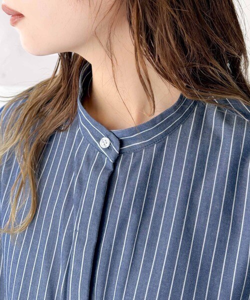 すっきりとした印象のバンドカラーが顔まわりを引き立て、洗練された雰囲気に。