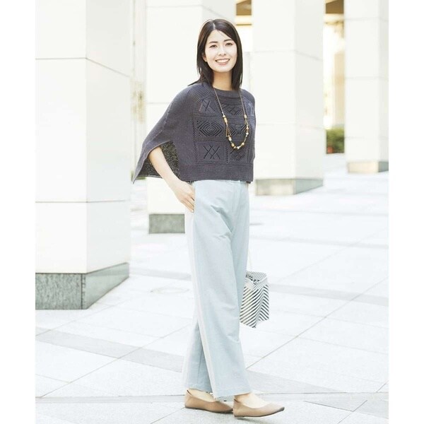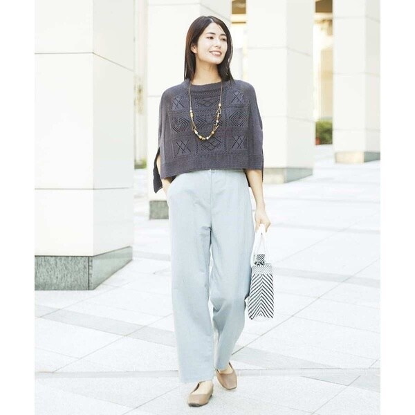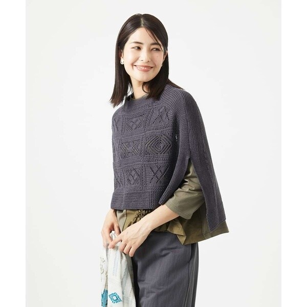 レース編みでかぎ針風の編地をブロックごとに変化させて編み上げた、ポンチョ風ベストです。袖はついていないデザインですが、脇にスリットが入っているので腕が動かしやすくなっています。程よい高さの首元もポイントに、編地が魅力的な上質さを感じるデザイン。