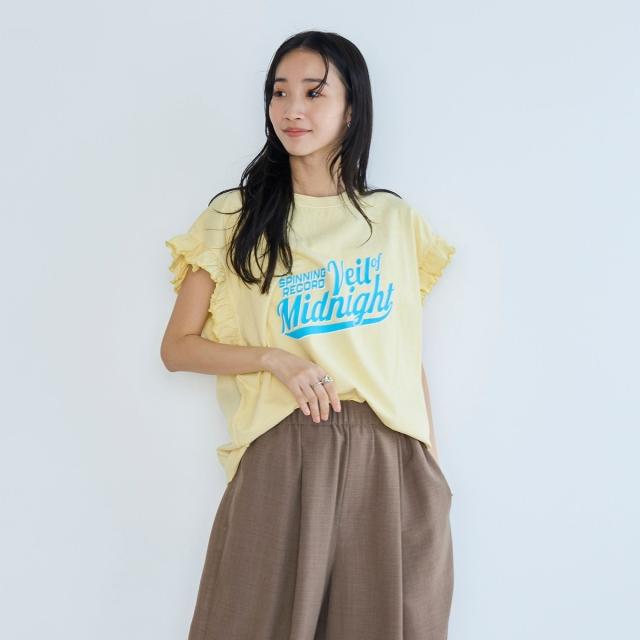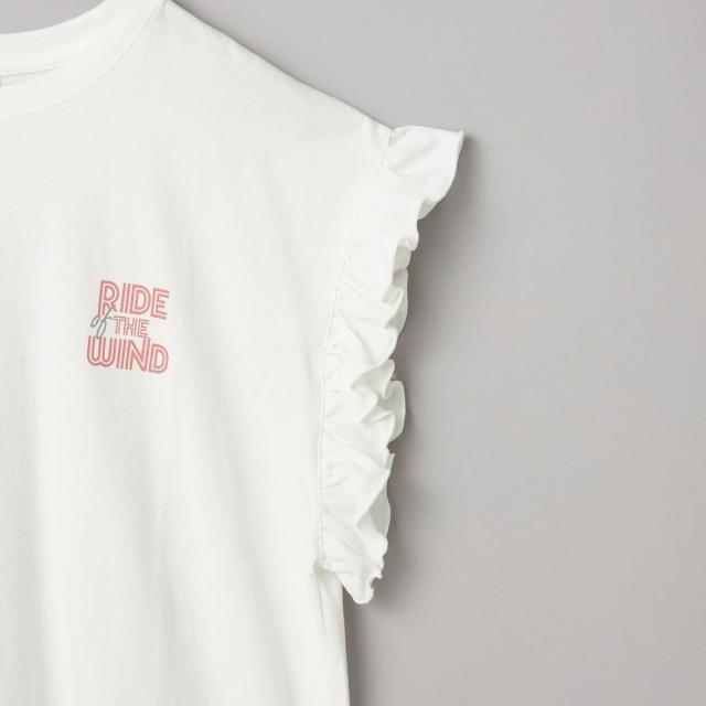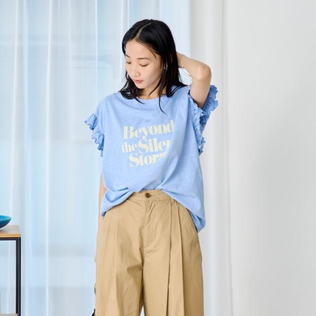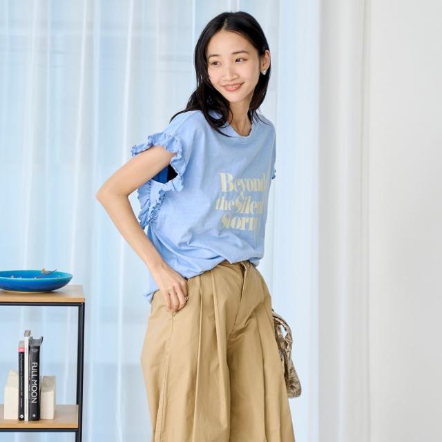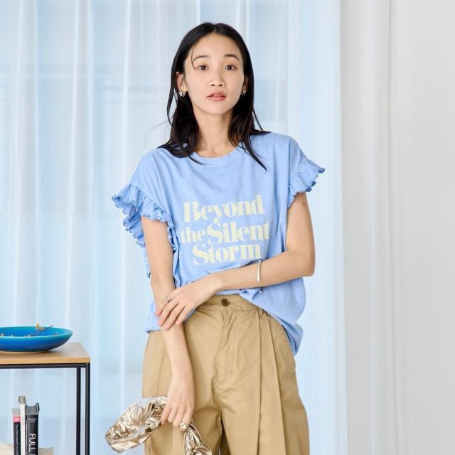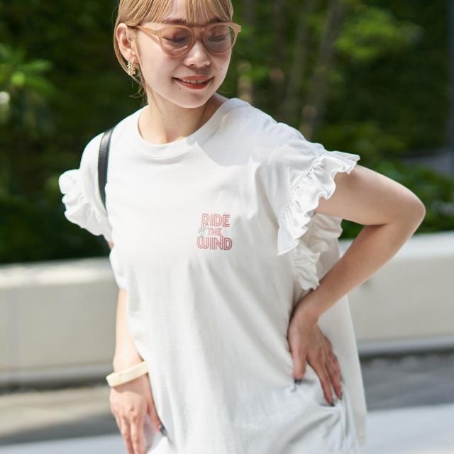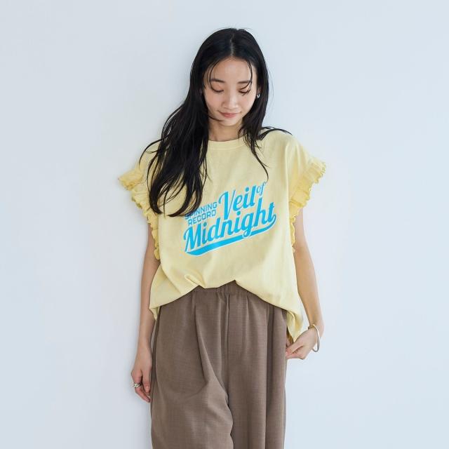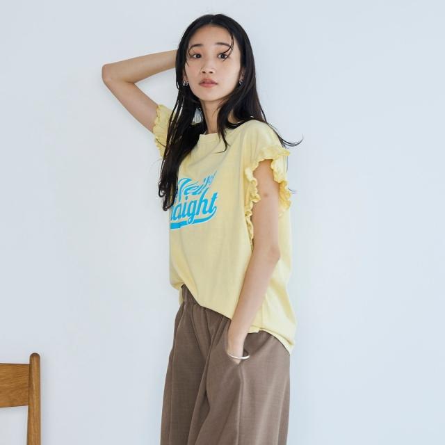春夏気分を上げてくれるカラーと可愛らしいフリル袖が魅力のプリントTEE。
