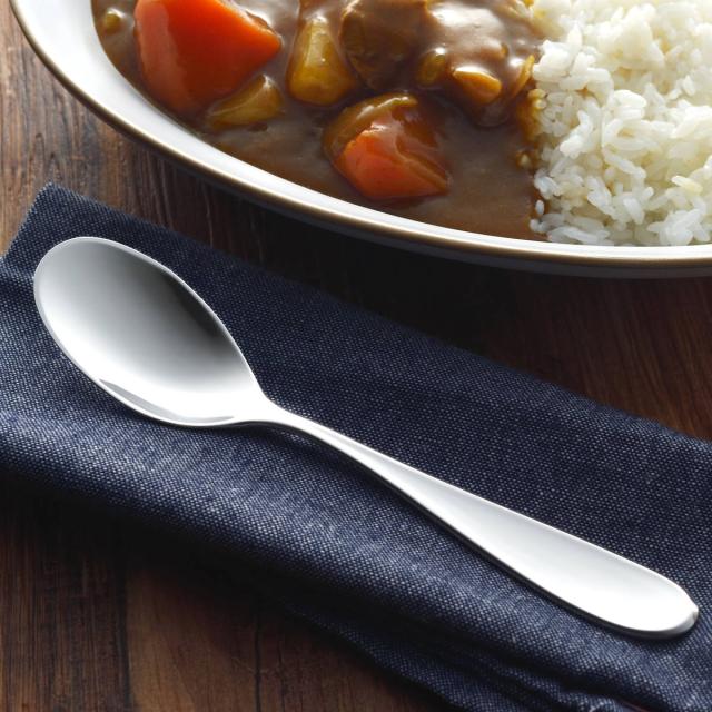 耐久性に優れたステンレス製のスプーンは、食事の色が付きにくく丈夫でサビにくいのが特徴です。金属加工の産地である新潟県燕三条地域で製造されています。
