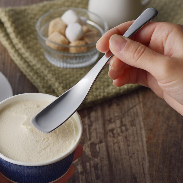 平らな先端で容器の底まできれいにすくえるアイススプーンです。スリムな形状でお年寄りやお子様にも使いやすいです。