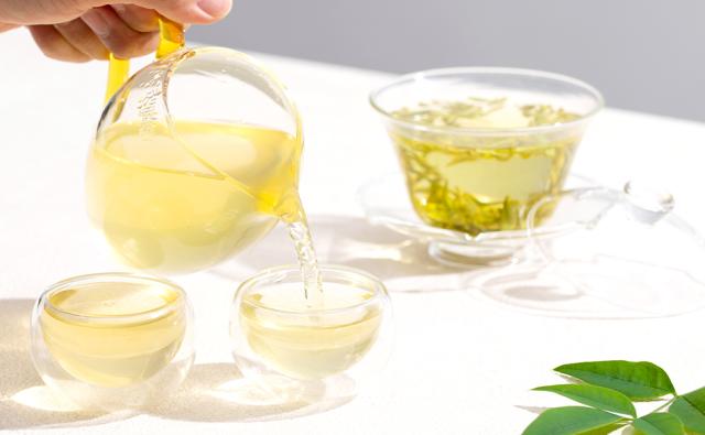 釡炒り緑茶ならではの透明感あふれる薄黄色。澄んだ透明感の中に、