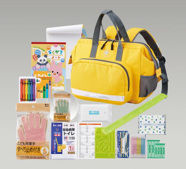 セット内容:避難用リュック、ホイッスル、反射リストバンド、反射シール、携帯トイレ(大小兼用)1P、ウェットティッシュ(10枚)、子供用軍手(グリーン・ピンク アソート(指定不可))、エイトバン(大小×各2)、綿棒10P、ポケットティッシュ、クレヨン、らくがきノート、IDカード