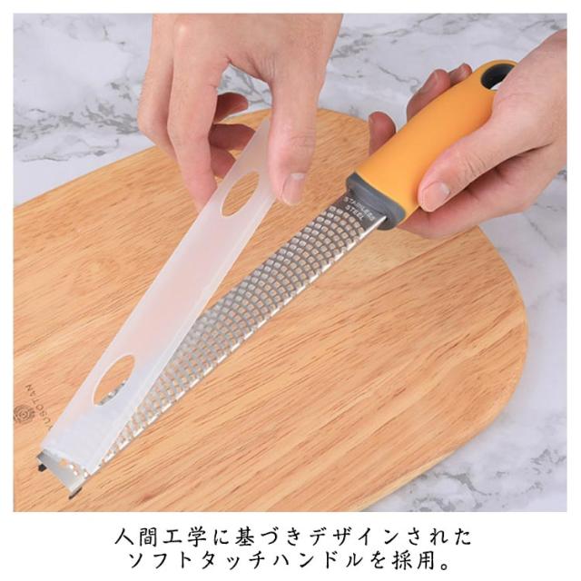 | ハードチーズから生姜、ニンニクまで幅広い食材のカットに適しています。 人間工学に基づきデザインされたソフトタッチハンドルを採用。 また、ハンドルにフック穴付きので、フックに掛けて収納することができるので省スペースです。 保護カバー付きの脱着は簡単で、刃の先端を合わせて滑らすだけ。 | |