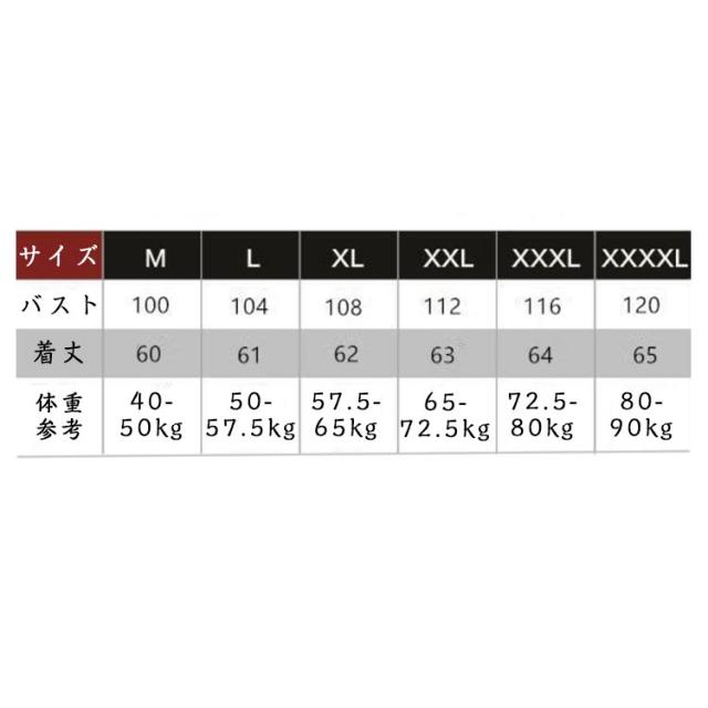 | サイズについての説明 | M バスト(100cm) 着丈(60cm) 体重参考(40-50kg) L バスト(104cm) 着丈(61cm) 体重参考(50-57.5kg) XL バスト(108cm) 着丈(62cm) 体重参考(57.5-65kg) 2XL バスト(112cm) 着丈(63cm) 体重参考(65-72.5kg) 3XL バスト(116cm) 着丈(64cm) 体重参考(72.5-80kg) 4XL バスト(120cm) 着丈(65cm) 体重参考(80-90kg) ※測定方法によって誤差が生じますので、予めご了承下さい。 |