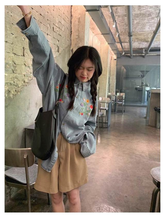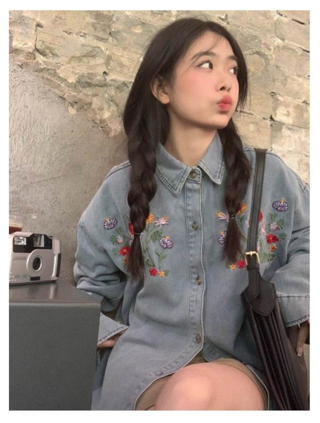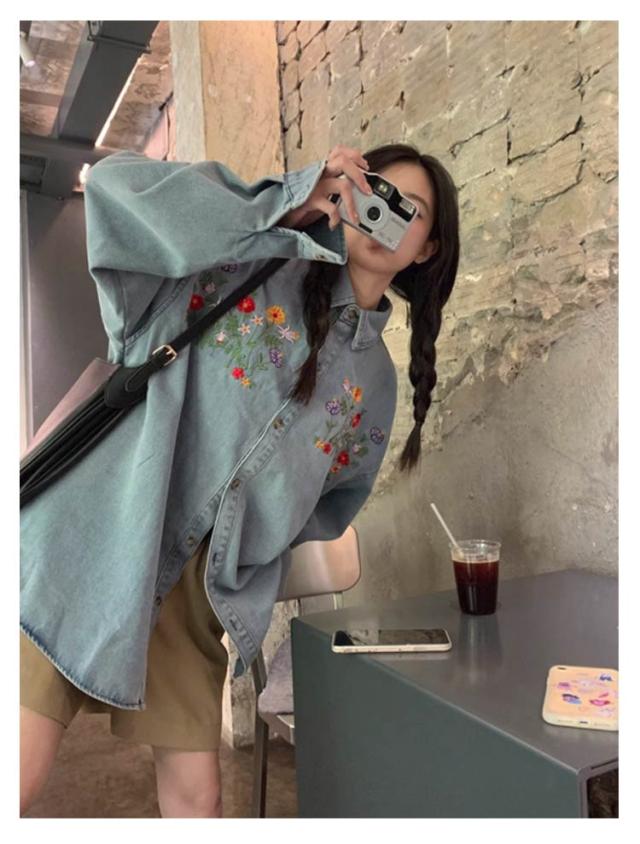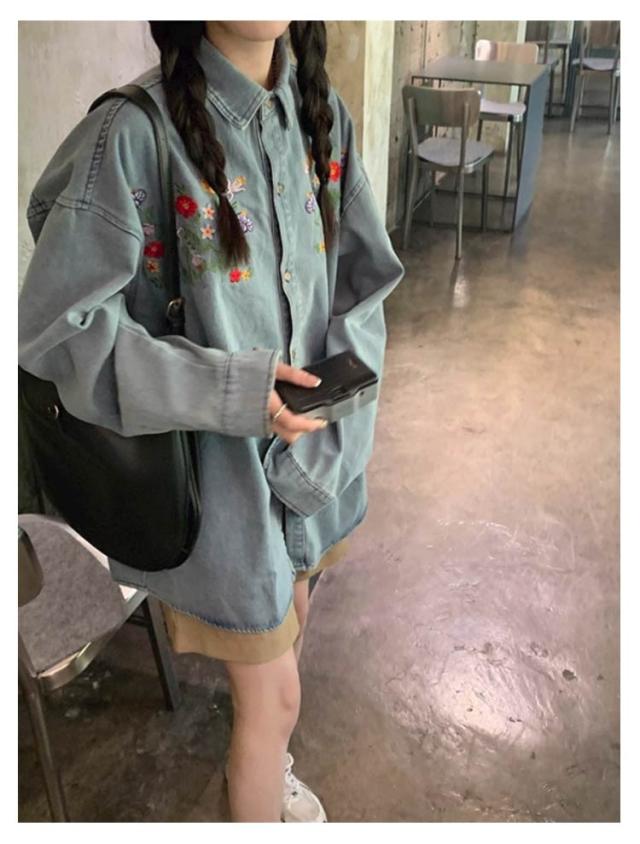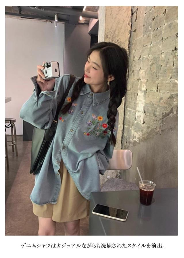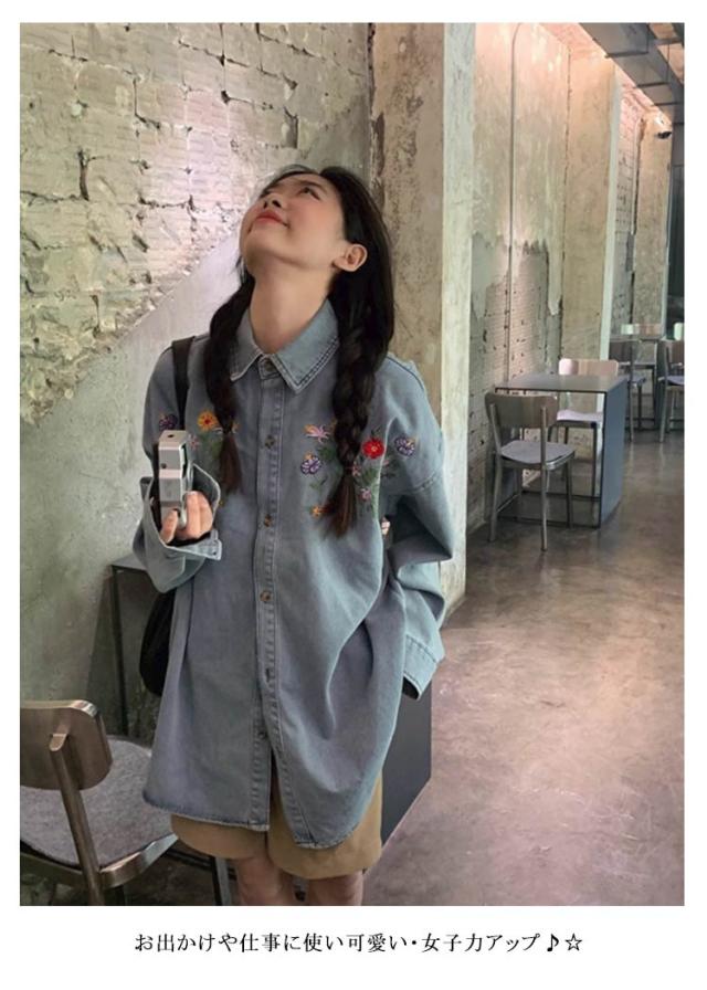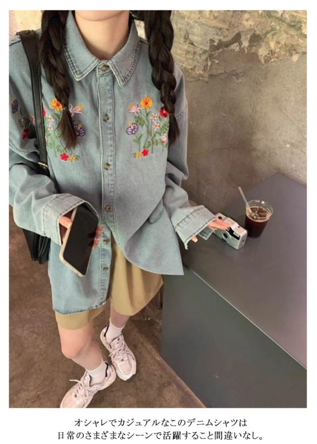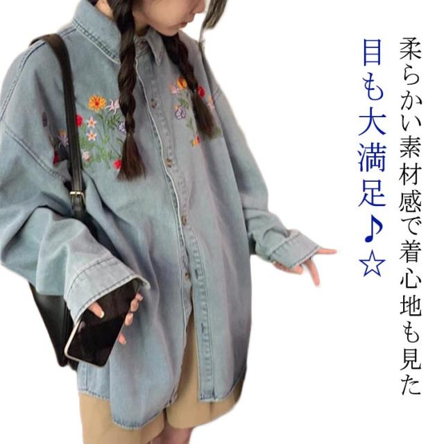 レディース ラウンドヘム デニム 花柄刺繍シャツ 刺繍デニムシャツ 折襟 送料無料 シャツ トップス 長袖 ゆったり 長袖シャツ 長袖デニムシャツ オシャレ きれいめ 可愛い デニムシャツ ブルー カジュアル 森ガール レトロ 20代