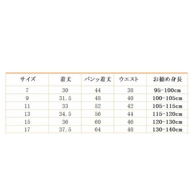 | サイズについての説明 | 【7】 参考身長95-100cm 【9】 参考身長100-105cm 【11】参考身長105-115cm 【13】参考身長115-120cm 【15】参考身長120-130cm 【17】参考身長130-140cm |